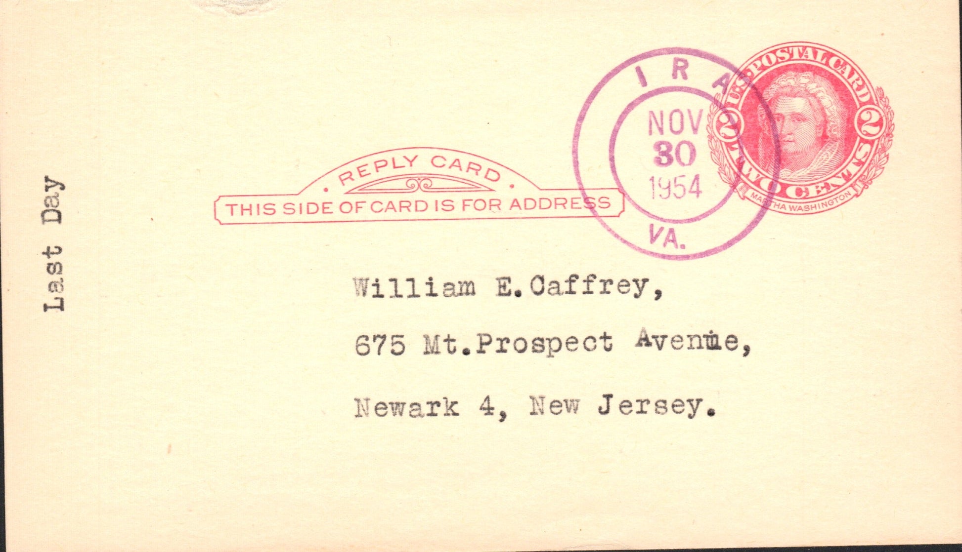 Ira (1902-1954) 1954 double circle on LD Postal Card