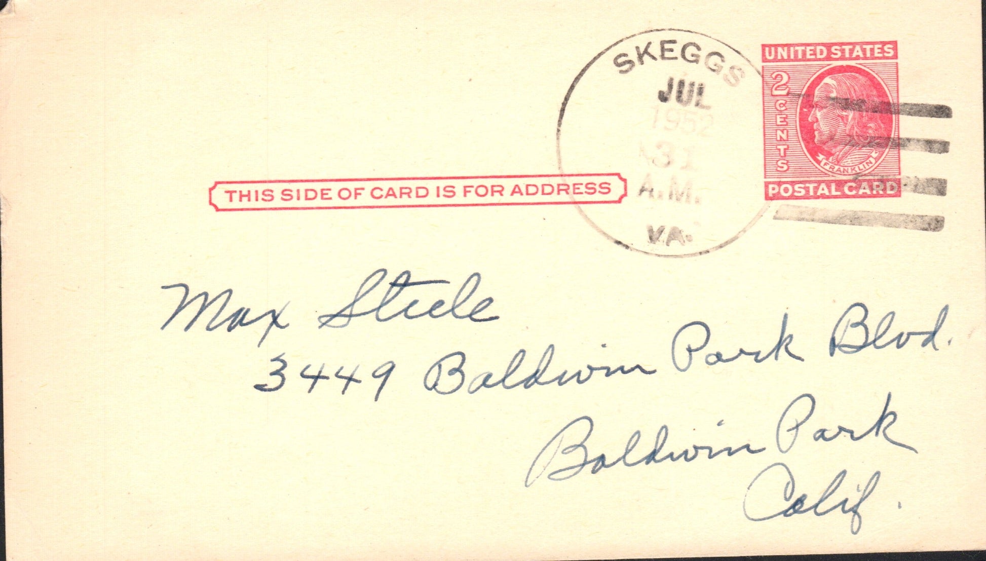 Skeggs (1903-1952) 1952 4-bar on LD Postal Card