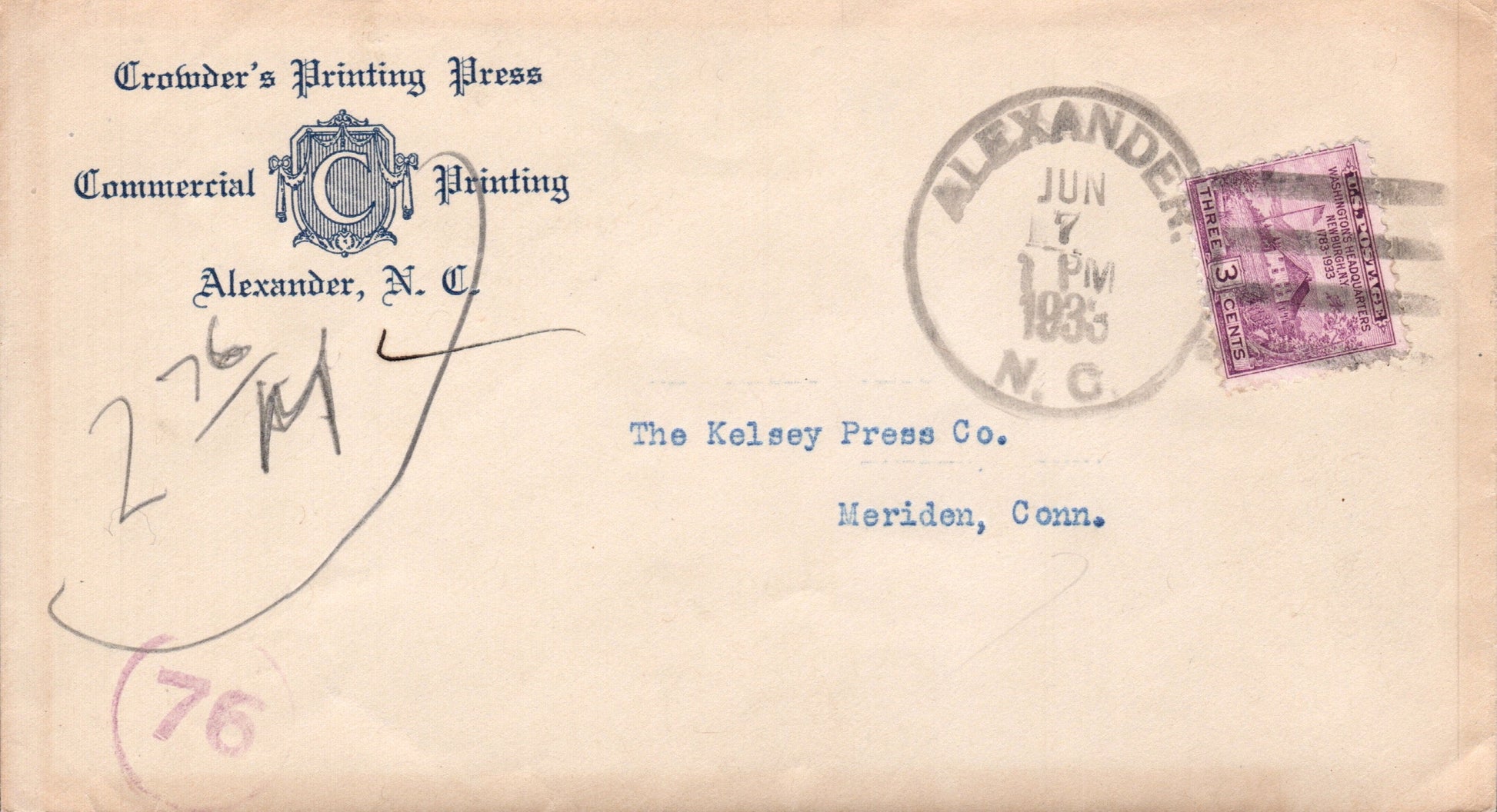 - Alexander 1933 4-bar on cover, “Crowders Printing Press” corner