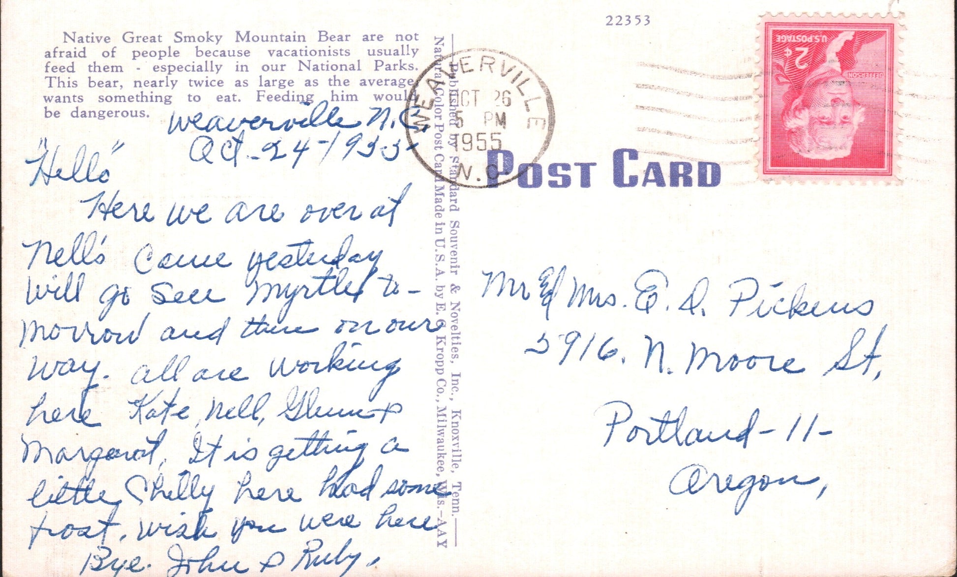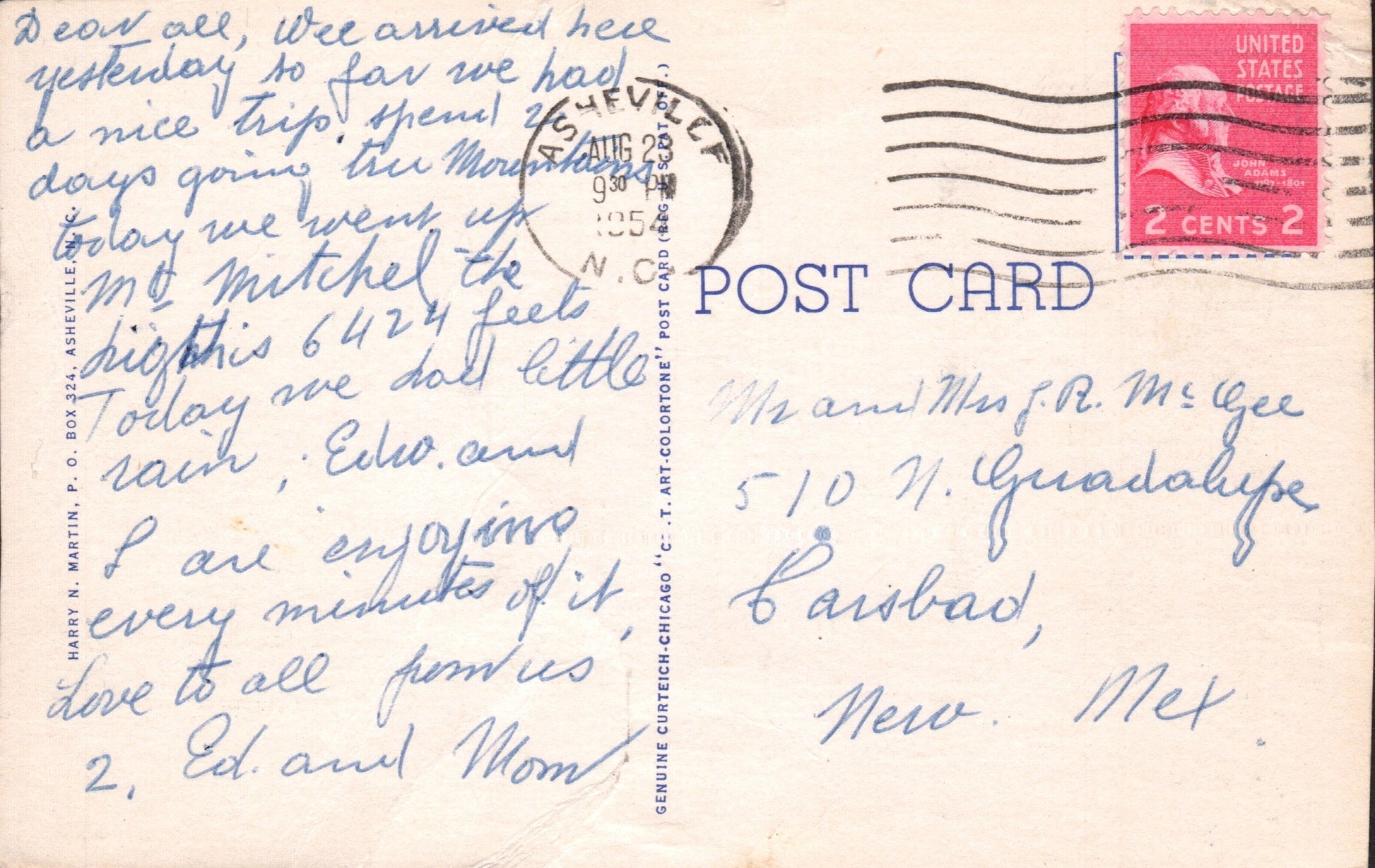 - Asheville 1912 Flag cancel on post card; 1954 machine cancel on post card
