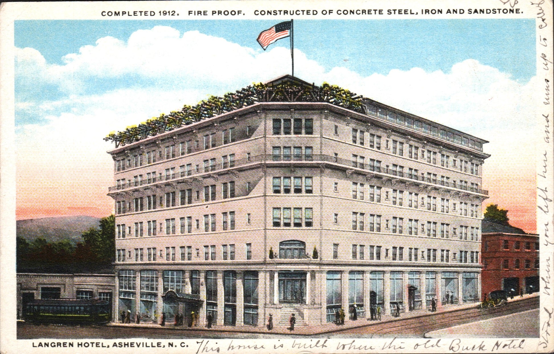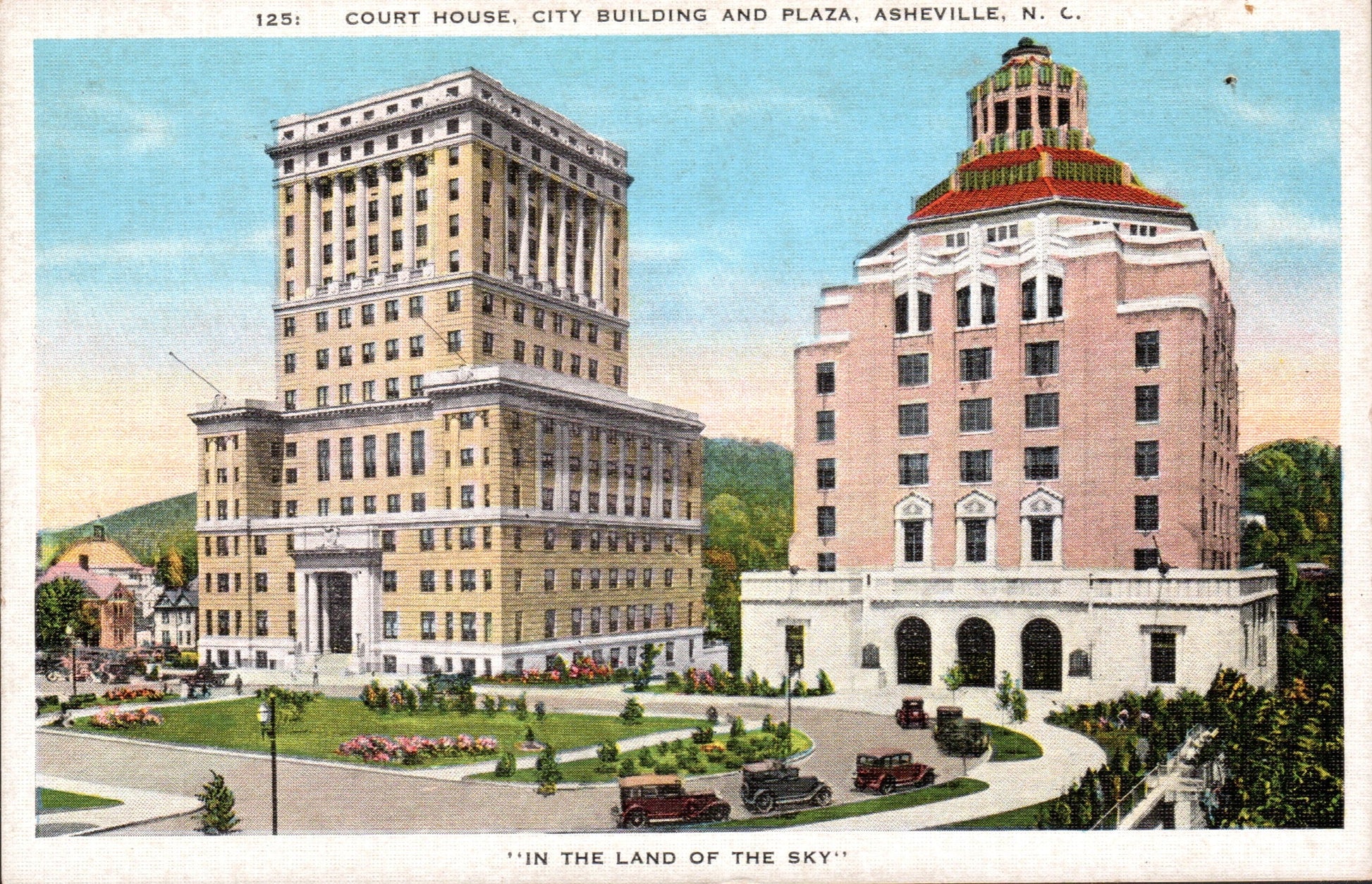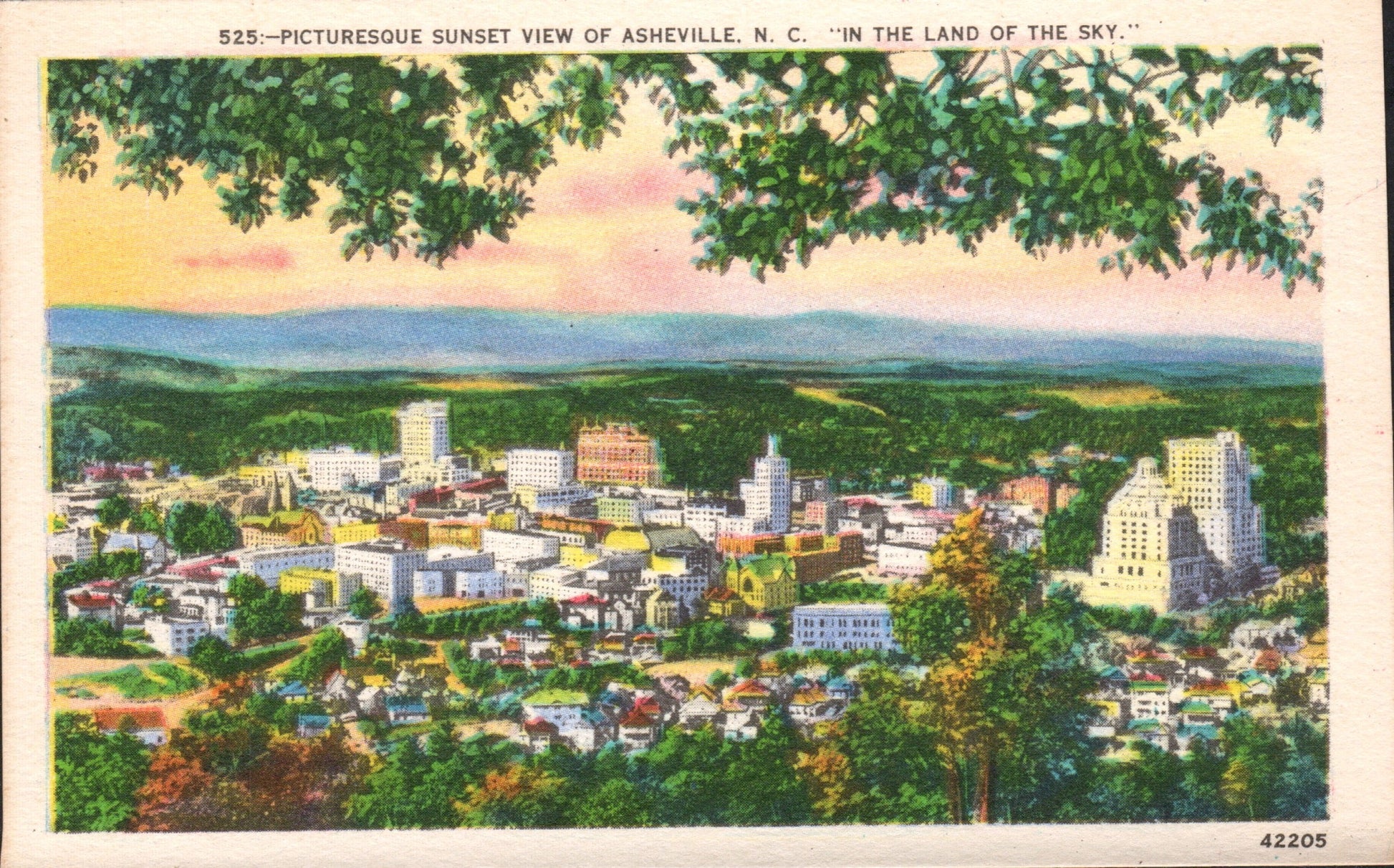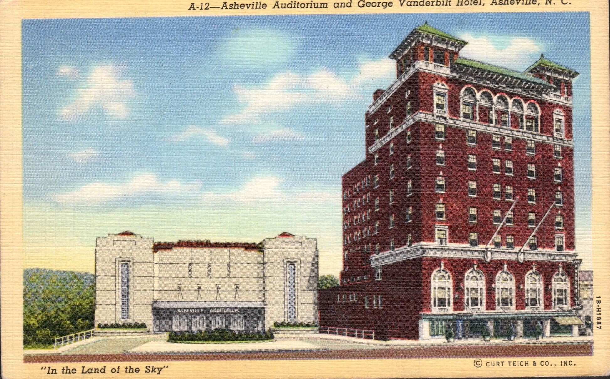 - Post cards: Overview of downtown [c.1940]; Skyline view [chrome]; Court House, City Building and Plaza [1920s]; “Pack Square from City Hall,” street cars [1910, bad corner]; Jackson Building [c.1910]; Battery Park Hotel [c.1910]; George Vanderbilt Hotel, Auditorium [linen, 1948]; Langren Hotel [c.1910]; Holiday Motel [chrome]; American Court [chrome]; Milestone Court {B&W, 1940s]; Twilight Court [chrome]; Beaver Lake Court [chrome]; Rock Haven Terrace [lodging]; chrome]; Bucks Restaurant [chrome]; Ference Cheese Shop [chrome]; Asheville Airport [chrome]; Post office [linen]; Florence Stephenson Hall [1936]; Masonic Temple [c.1910]; First Christian Church [linen]; Grove Park Inn [linen]