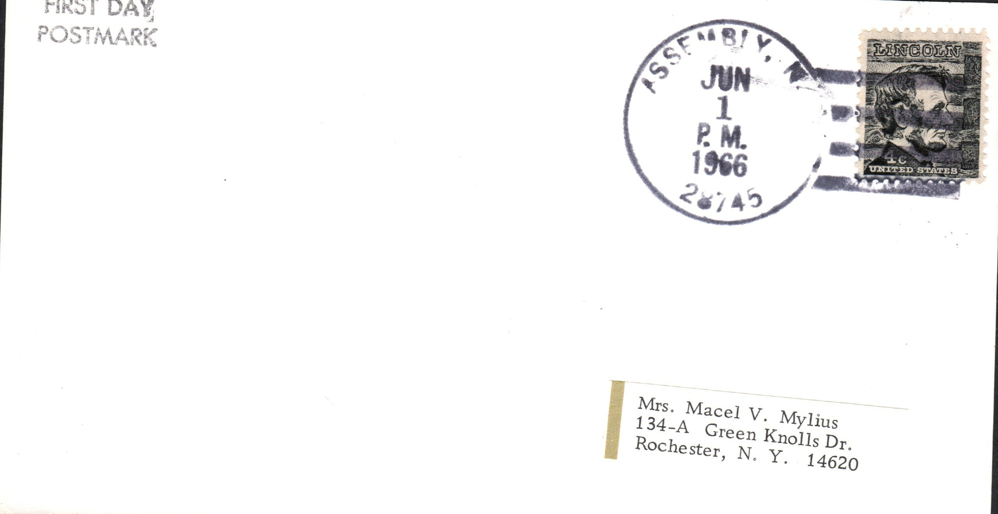 - Assembly RB (Lake Junaluska) 1966 4-bar on cover-sized card, round dater on back, FD of Rural Branch