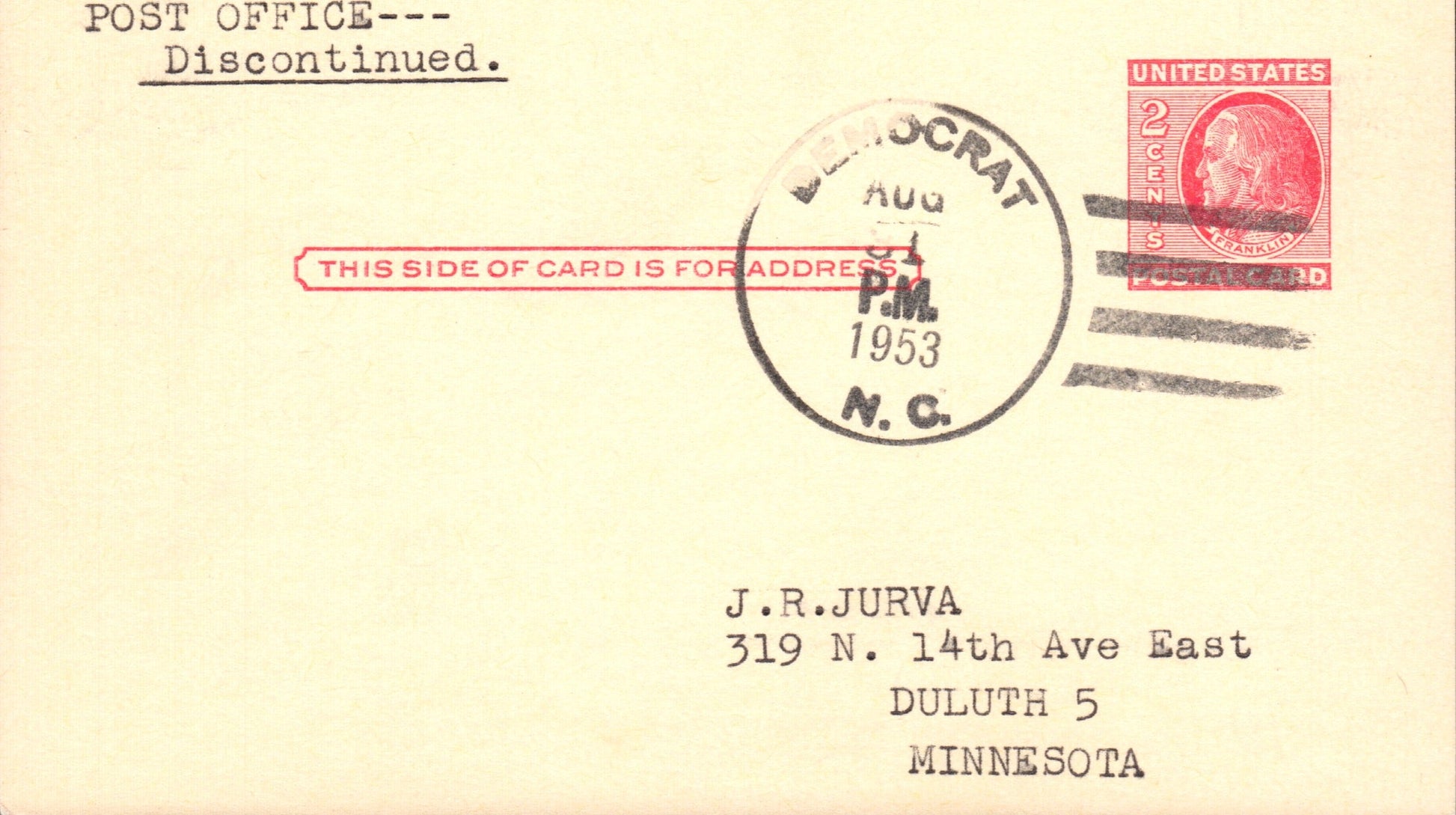 - Democrat (1847-1953) 1953 4-bar on LD Postal Card