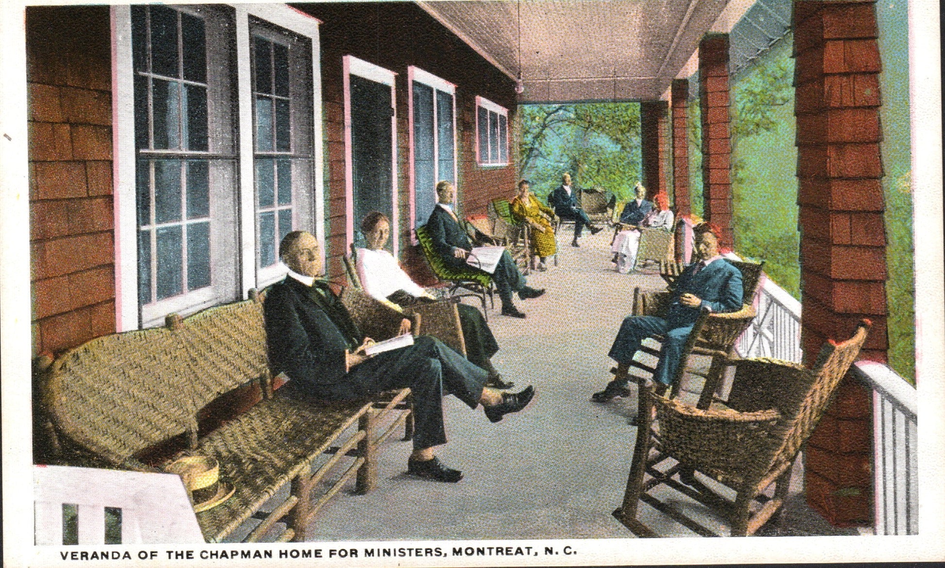 - Post cards: Assembly Inn [2 views, one linen, one chrome]; Anderson Auditorium [linen]; Howerton hall [chrome]; Moore Center [chrome]; Winsborough Building [chrome]’; “Veranda of the Chapman Home for Ministers” with 8 people, [c.1910]