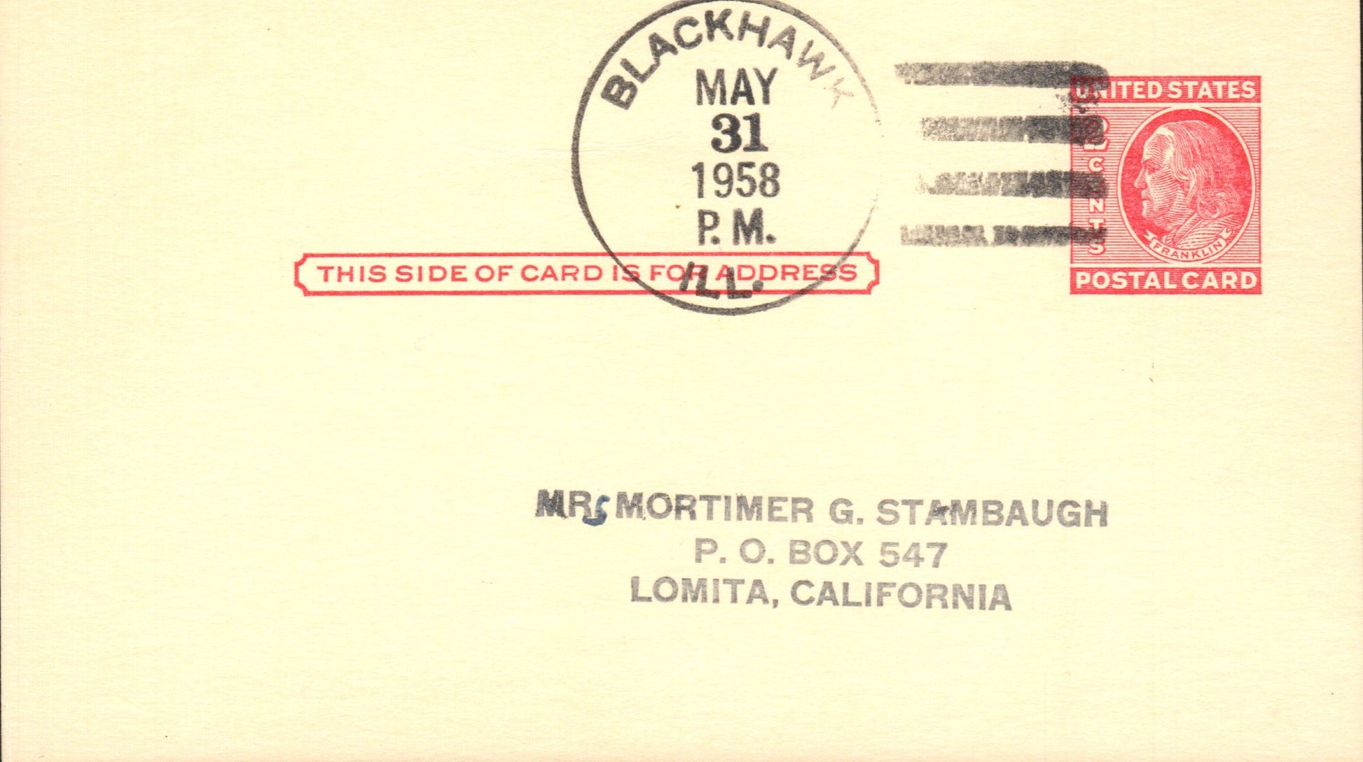 Blackhawk (1948-1958) 1958 4-bar on Postal Card
