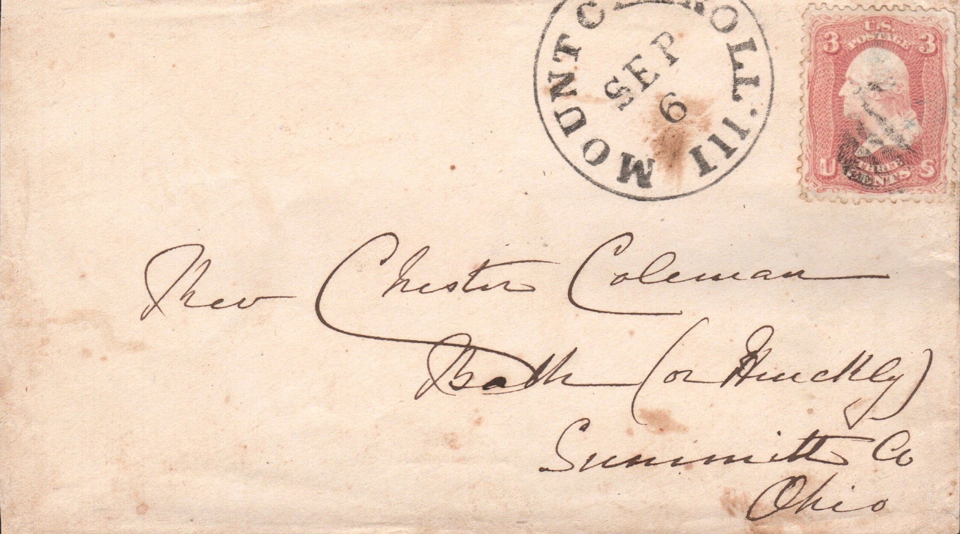 Mount Carroll bold c.1860 cds slightly off top of cover; c.1880 Octagonal postmark on cover; 1898 cds on cover, “Deering Harvester Co., 2¢ commemorative, Coalville Utah backstamp