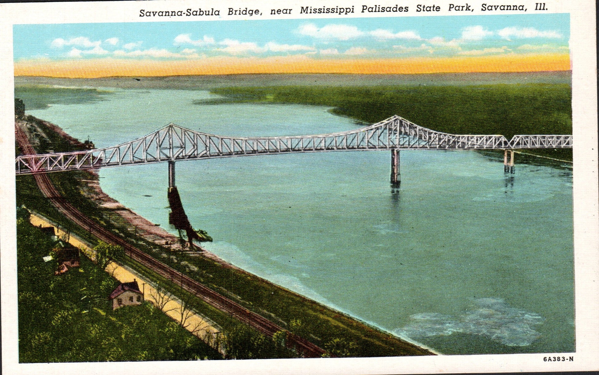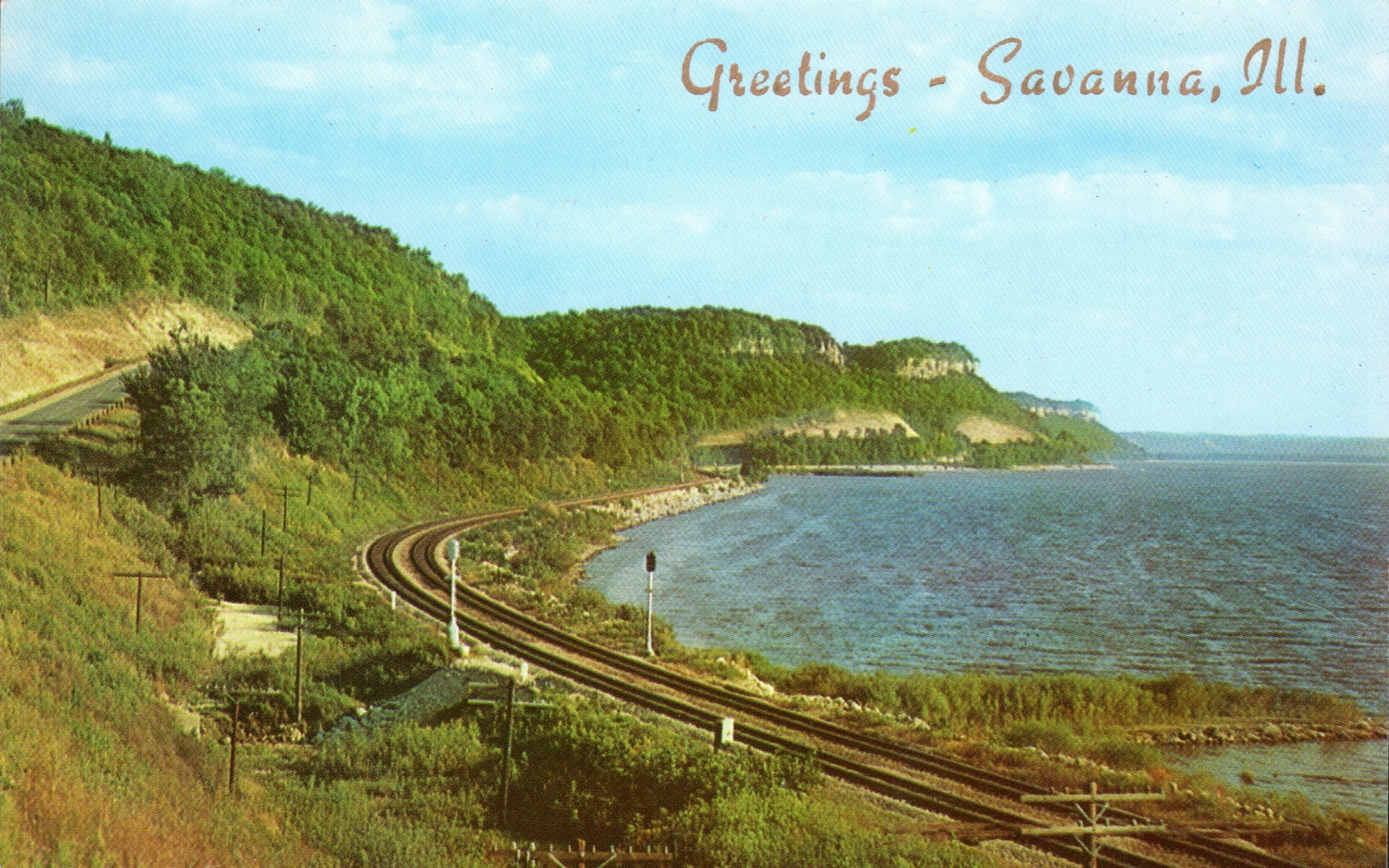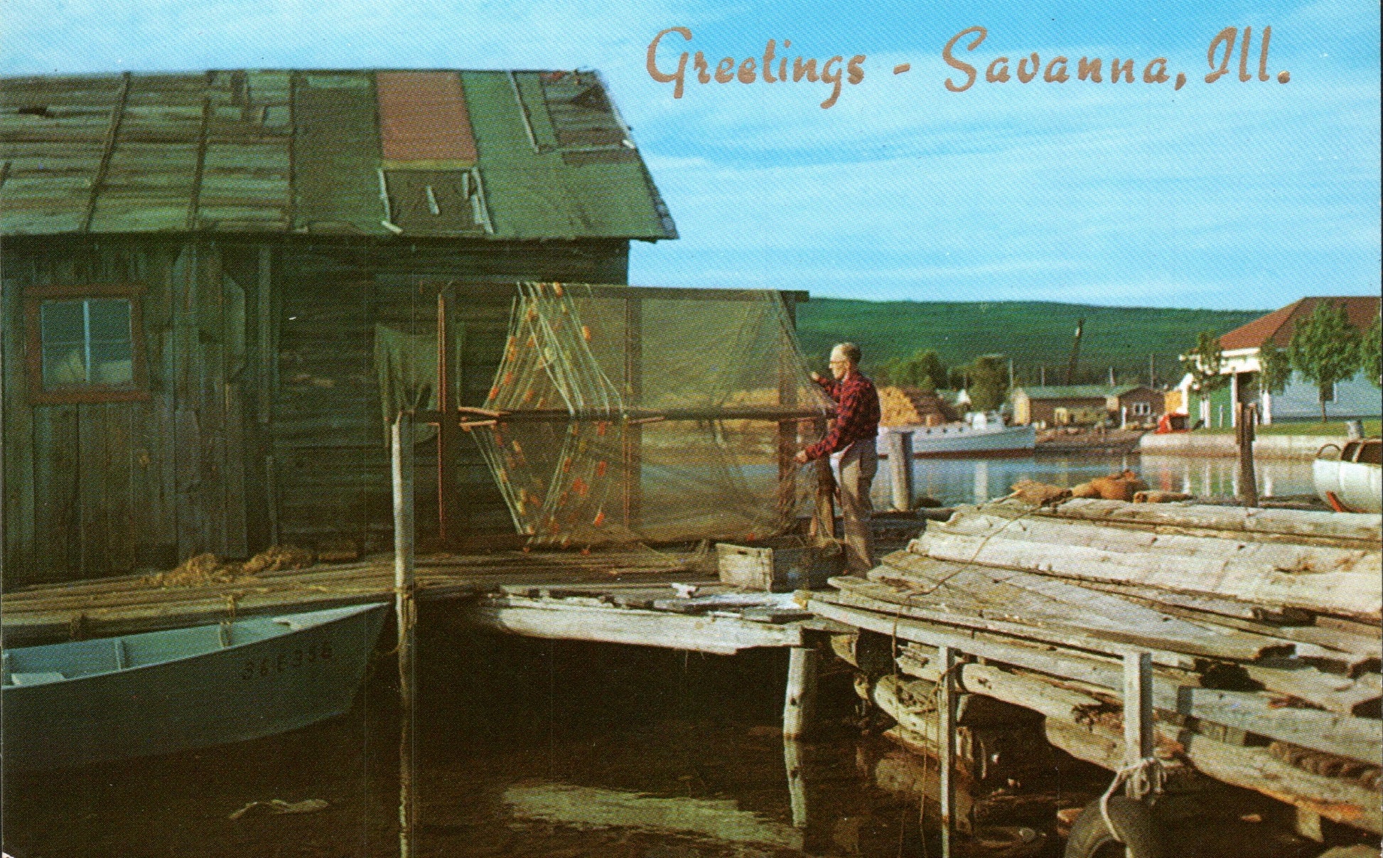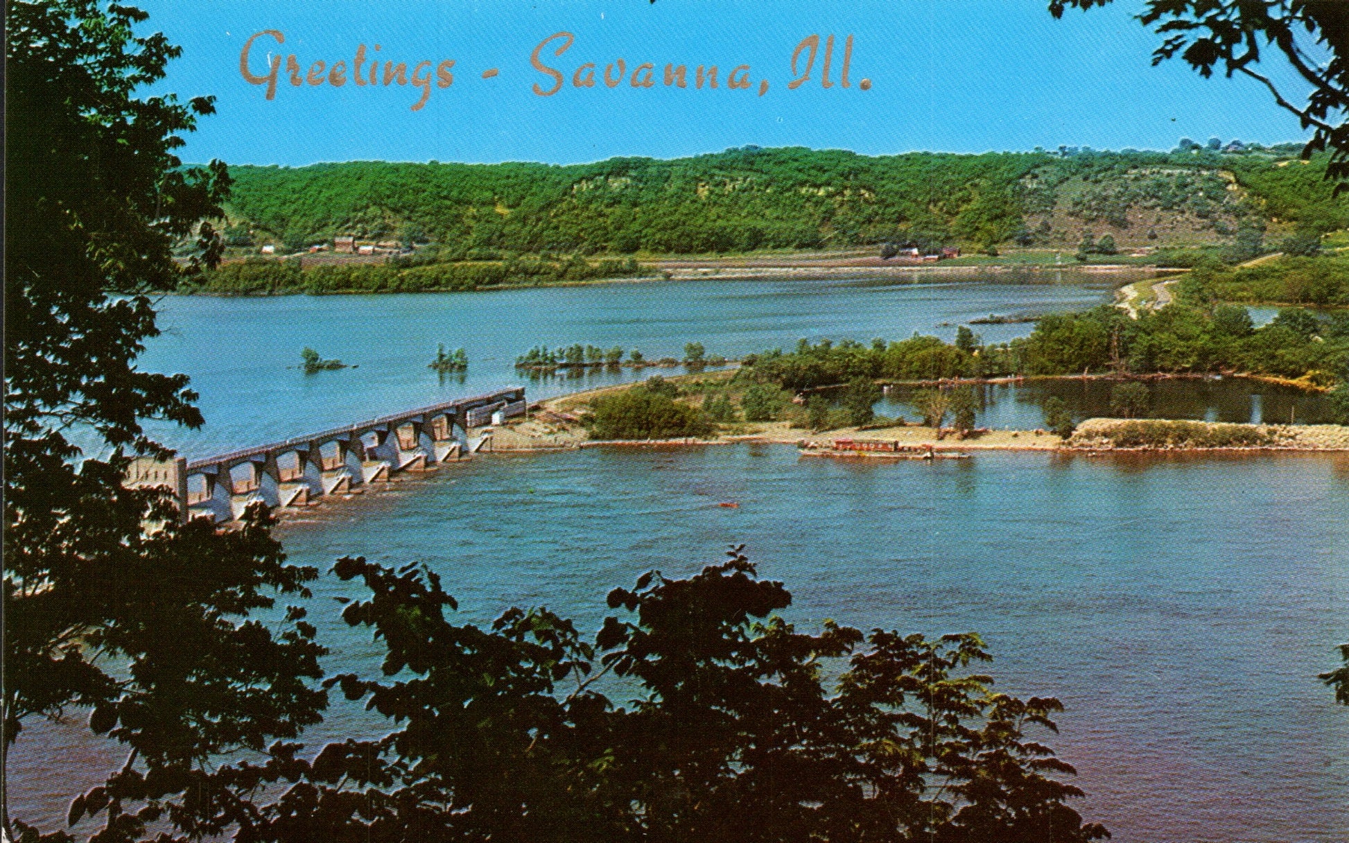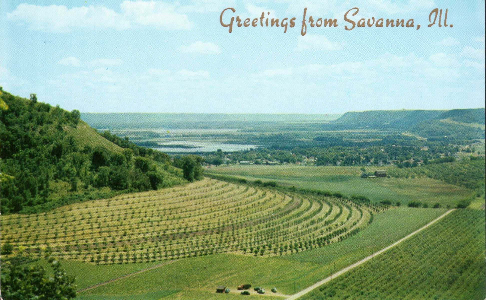 Post cards: Commercial fishermen, “Greetings from Savanna” [chrome]; Government Dam, “Greetings from Savanna” [chrome]; Mississippi River bend, “Greetings from Savanna” [chrome]; Con tour farming, “Greetings from Savanna” [chrome]; Savanna-Sabula bridge [linen]; The Bluffs [c.1910]; Mississippi River from the Bluffs [linen, postal scuffs]