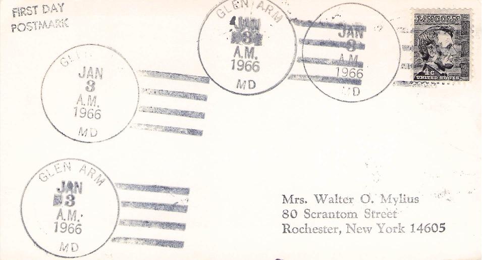 Glen Arm 1966 4-bar multiple strikes on cover-sized card, FD as two-word spelling