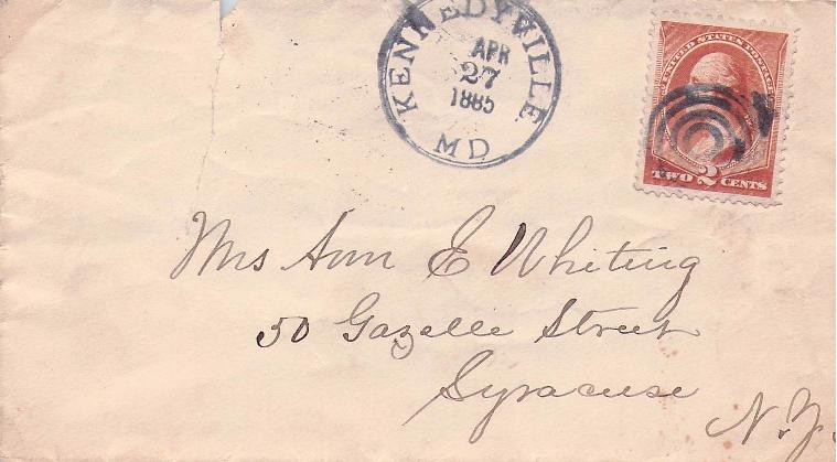 Kennedyville 1885 double circle on cover to Syracuse NY (tear)