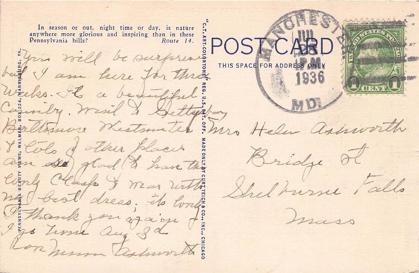 Manchester 1907 Doane 1 on post card; 1936 4-bar on post card
