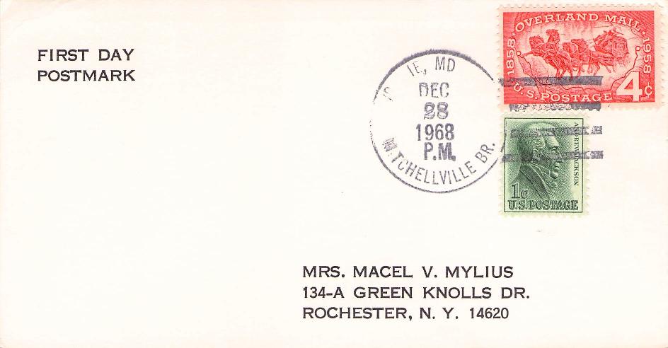 Mitchellville B 1968 4-bar on cover-sized card, FD of postal status