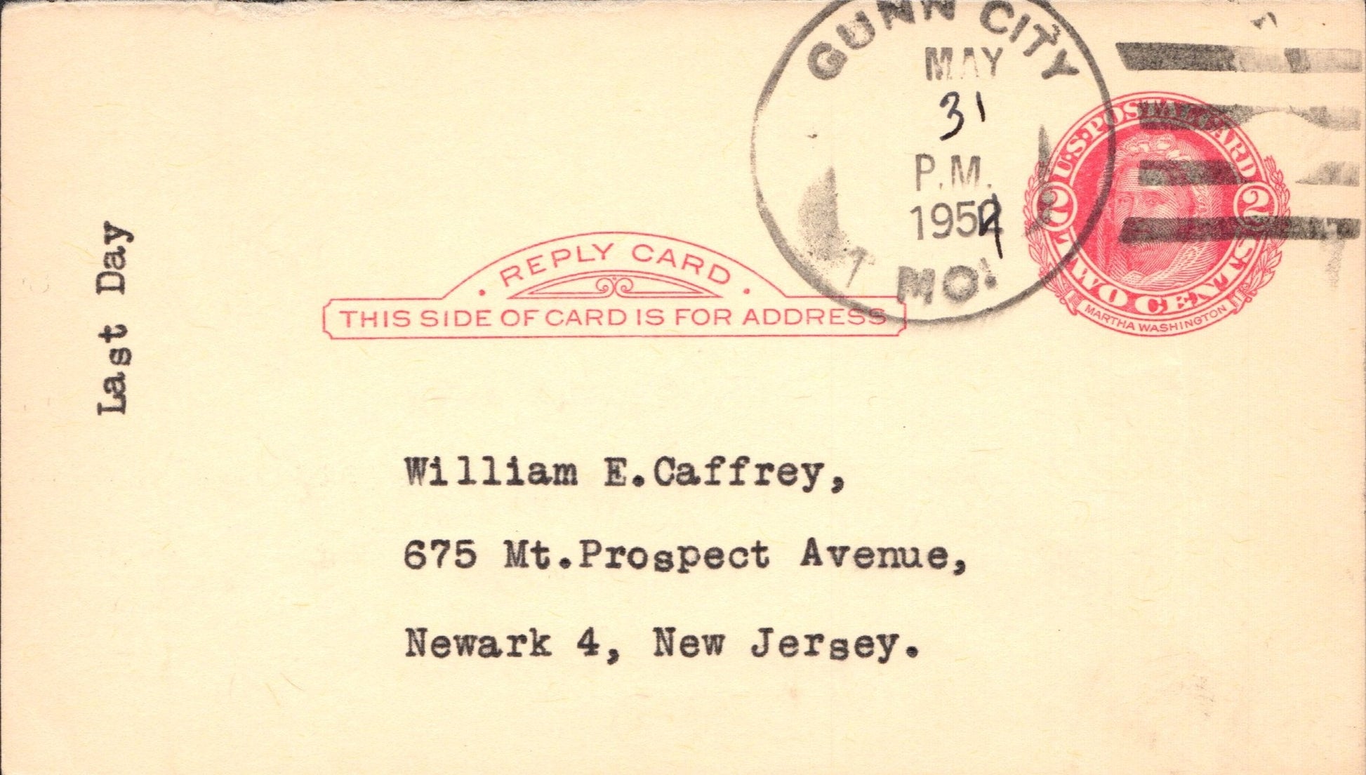 Gunn City (1892-1954) 1954 4-bar on LD Postal Card