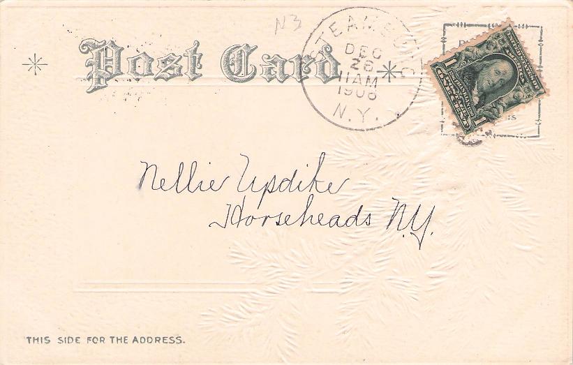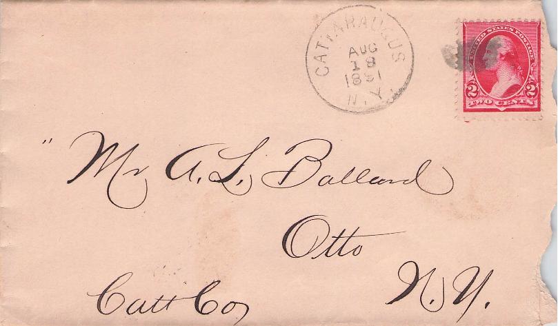- Olean 1890 cds & target killer on cover opened rough left, “Hotton & Sloane” corner, original contents; 1906 Flag cancel on post card; 1930 machine cancel on tiny cover; 1947 duplex on cover, also 3¢ Postage Due.