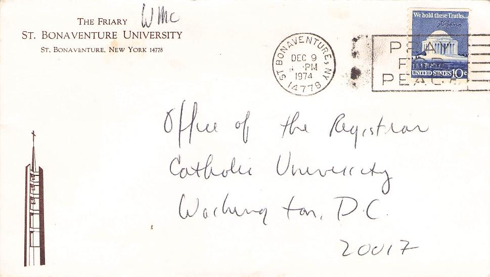 - St. Bonaventure 1974 machine slogan “Pray for Peace” on cover, “The Friary, St. Bonaventure University” corner