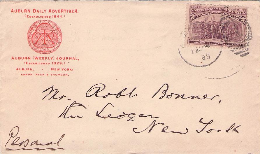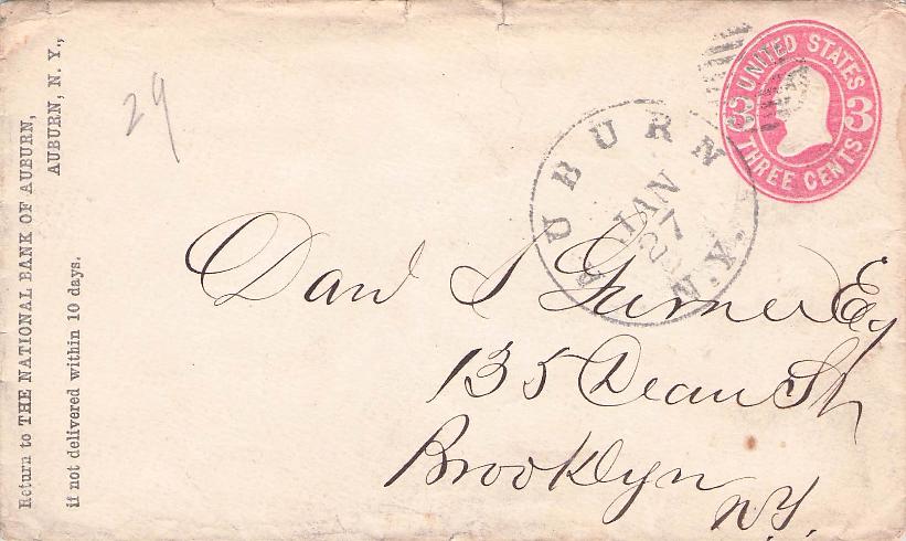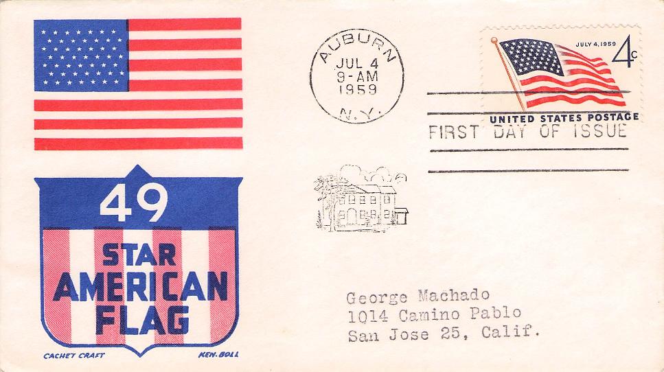 - Auburn c.1870 cds on cover, embossed corner “Dodge & Stevenson Mfg. Co.;” 1896 duplex on cover; 1937 machine cancel on cover; 1959 machine FD of Issue of 4¢ Flag stamp on cacheted cover, 49 Star American Flag; same, different cachet.