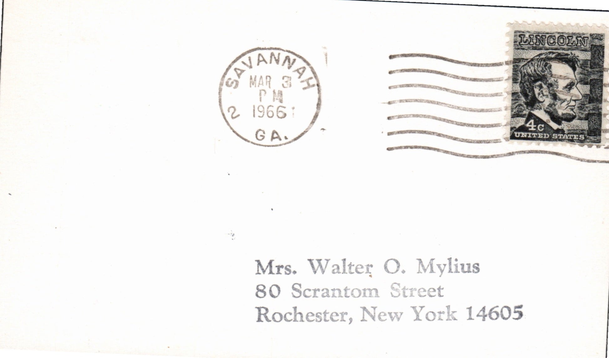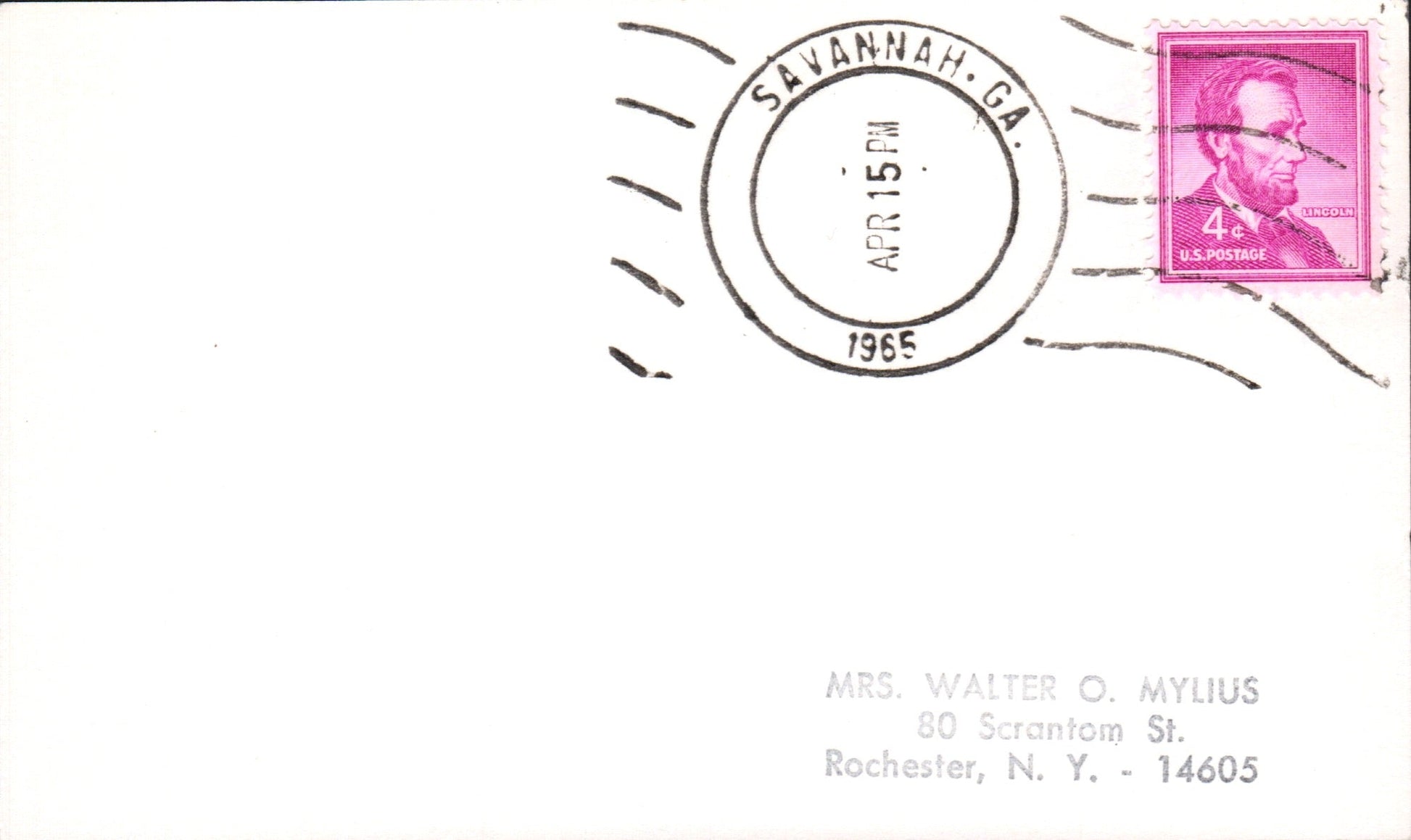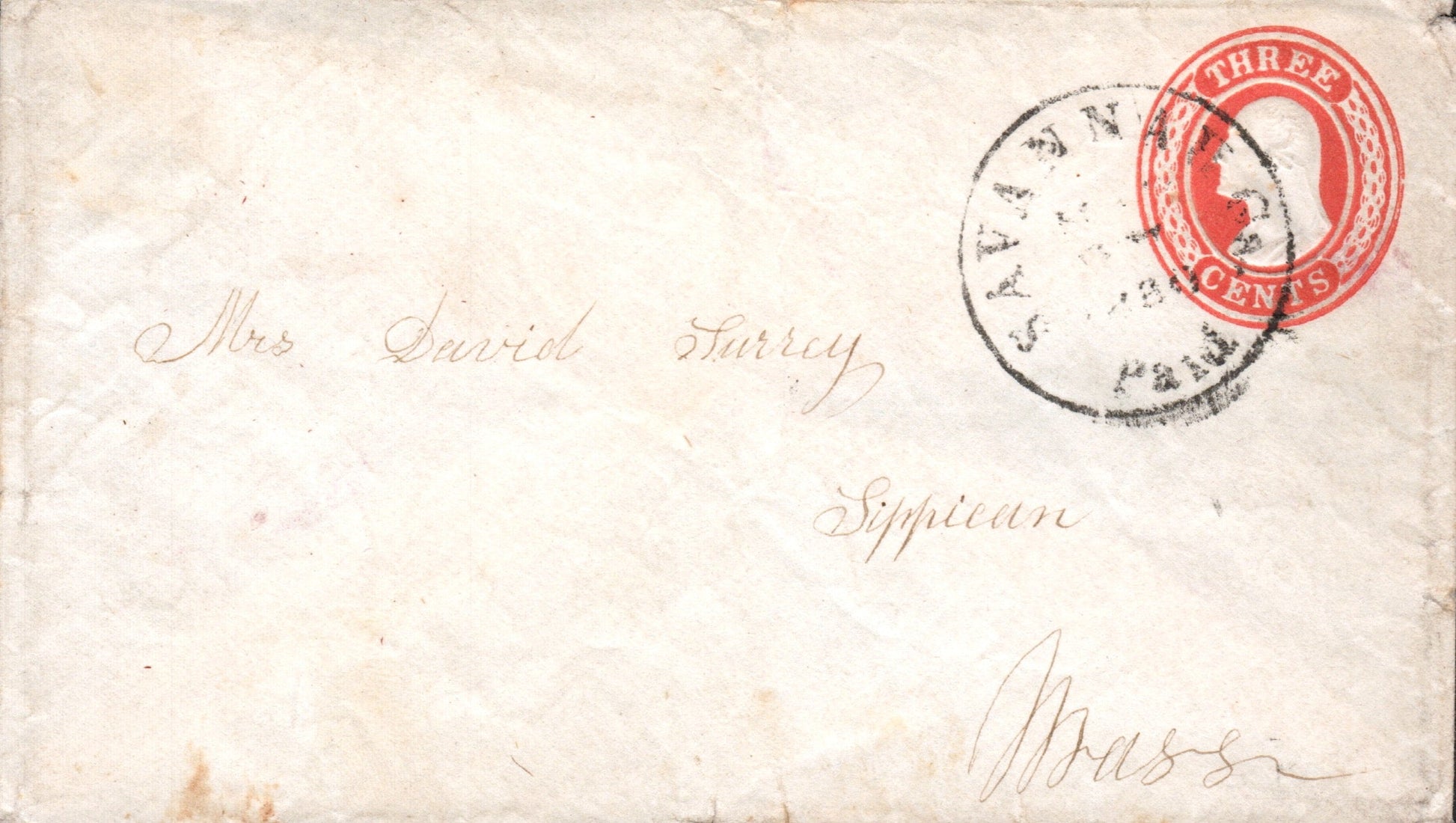 Savannah c.1850s cds “3 PAID” in dial on cover to Rhode Island; c.1860s cds “PAID”in dial on cover to Mass.; 1894 cds on cover; 1898 Flag cancel on cover; 1954 machine slogan “Wear Your Red Feather Proudly” on Postal Card; 1964 machine cancel on 3x5 card; 1965 roller on 3x5 card; 1966 machine cancel on 3x5 card, “2” in dial; 1970 machine slogan “Ability Counts” on post card view of Presbyterian church; 1979 4-bar on cacheted cover “Bicentennial Cover The Start of the Savannah Siege”