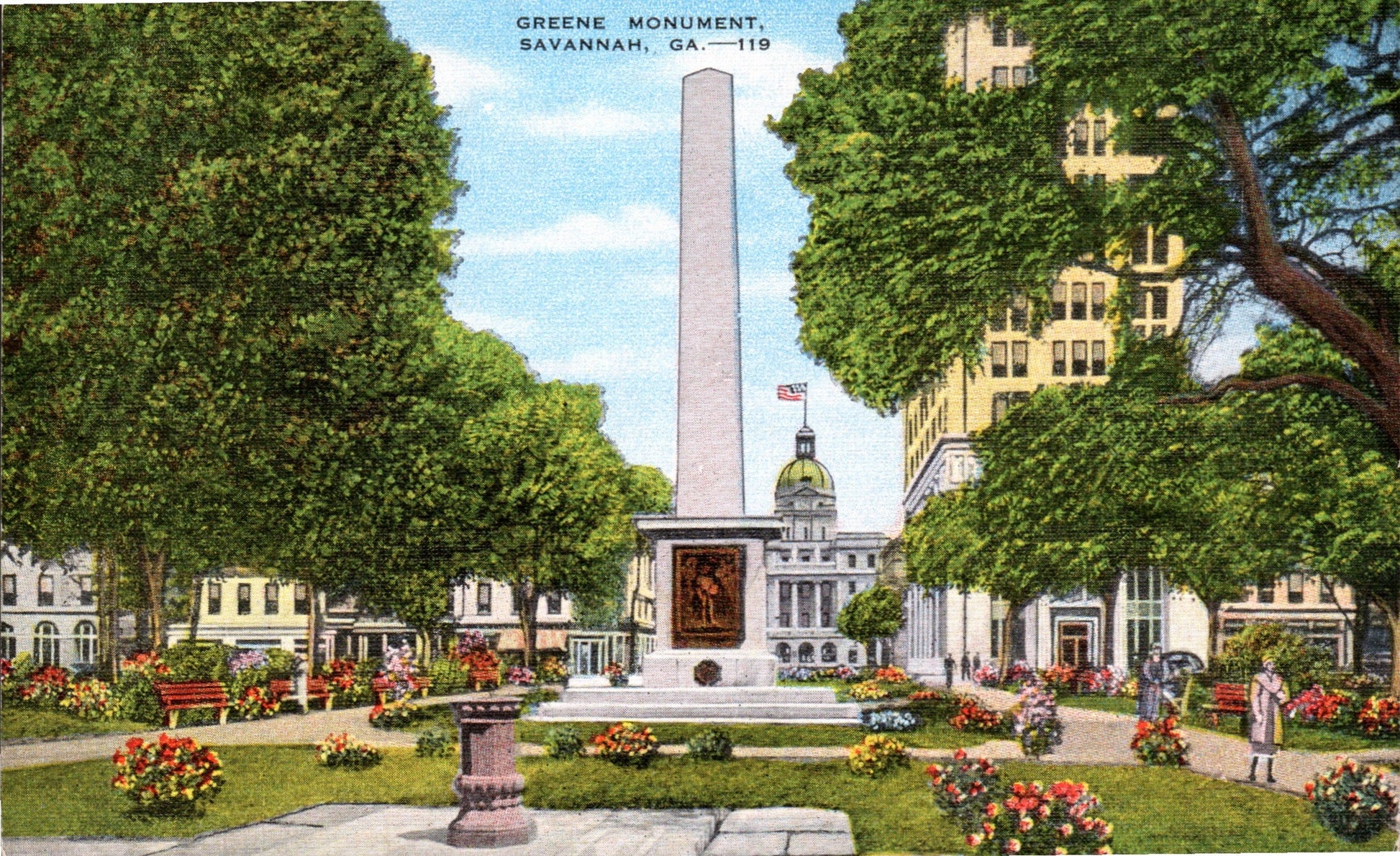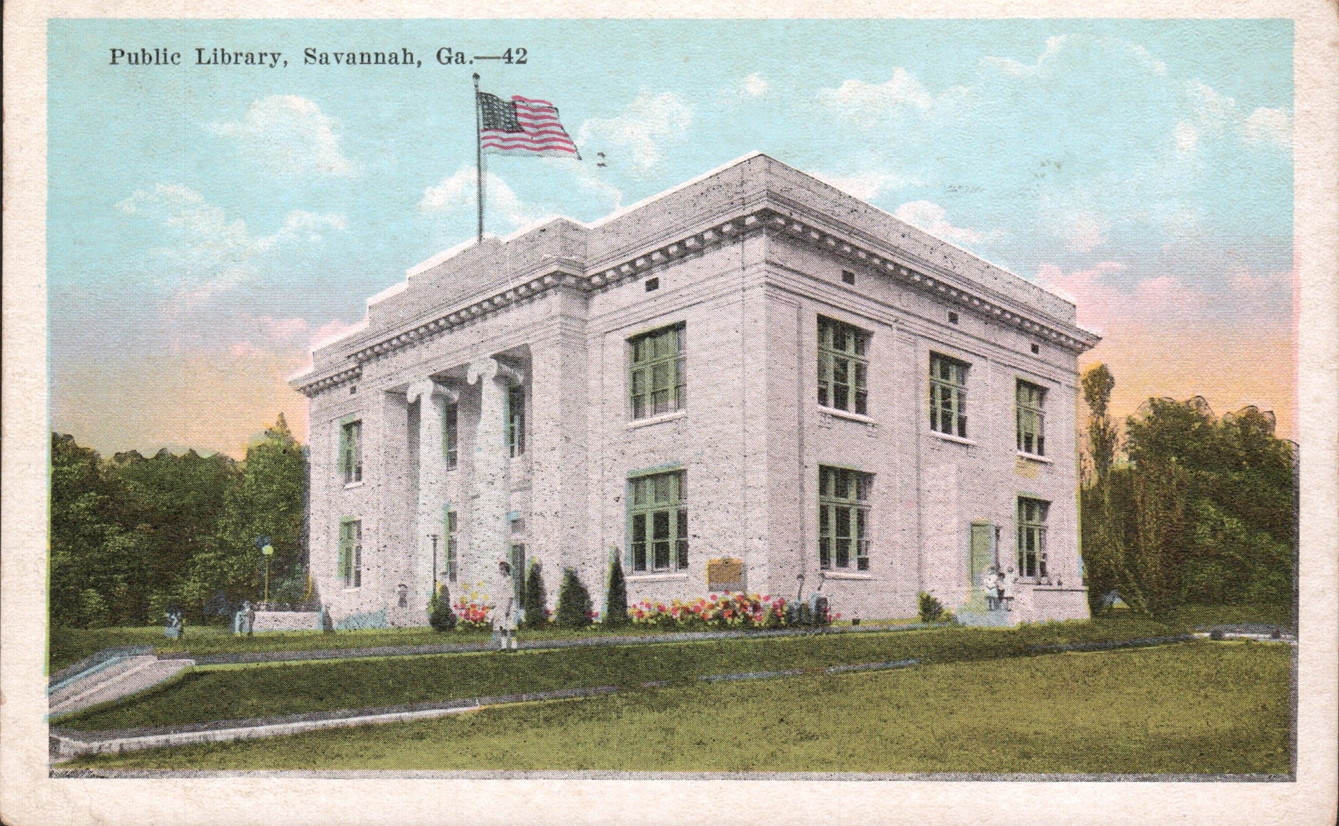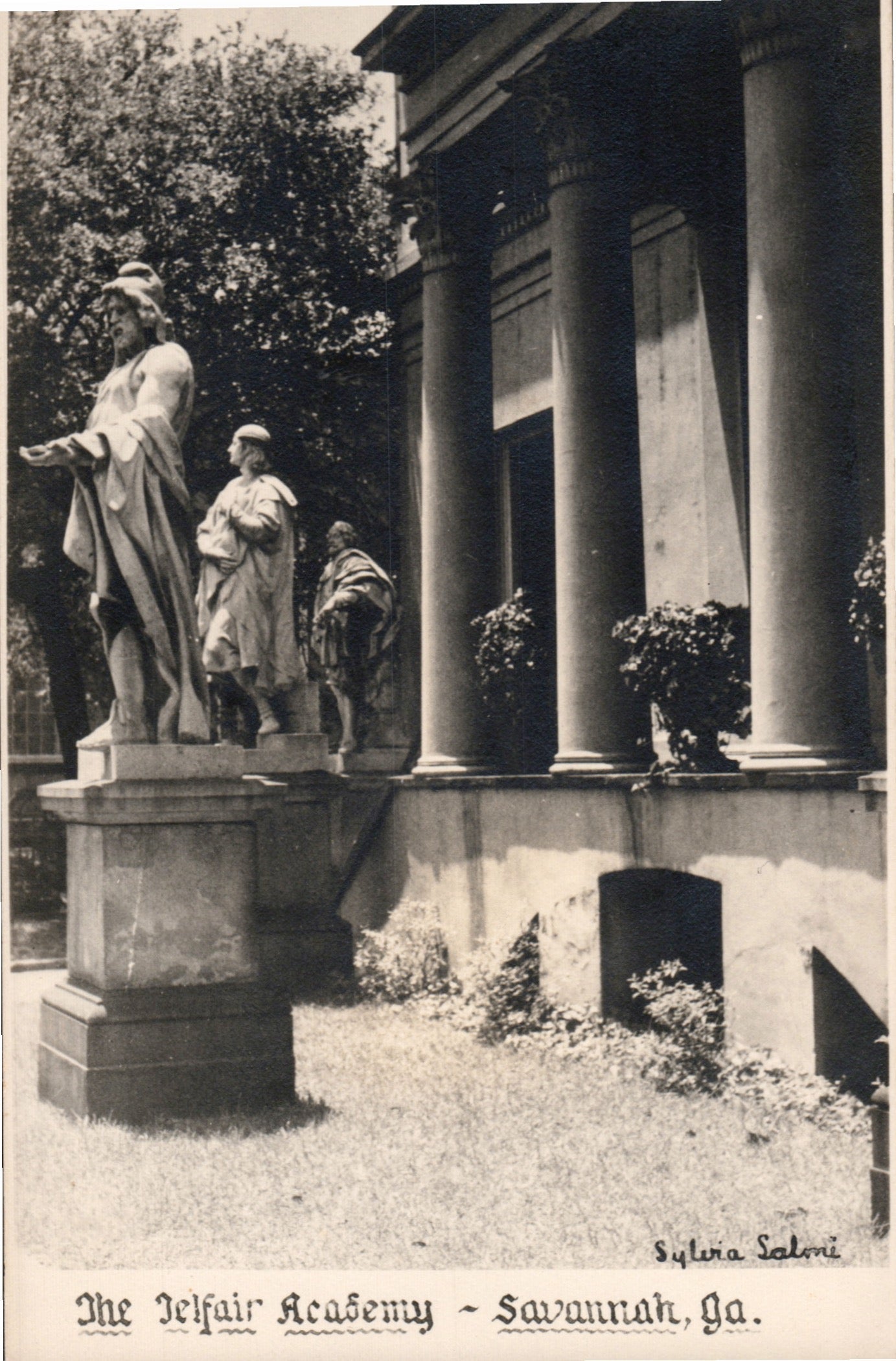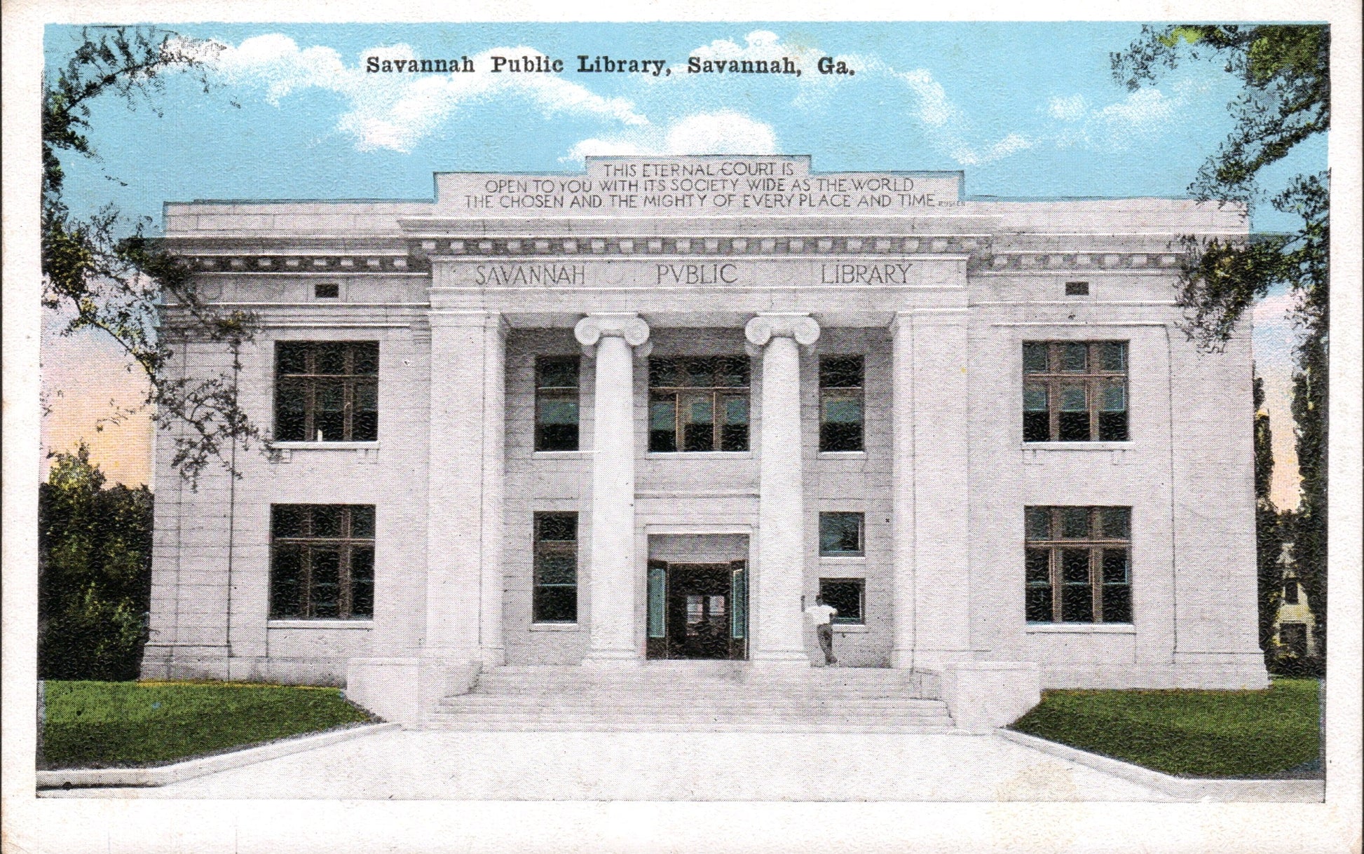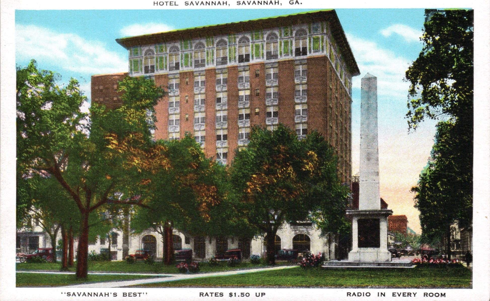 Post cards: “Hotel De Soto” [linen, 1948]; “Manger Towne & Country Motor Lodge” [chrome, 1980]; “Hotel Savannah” [c.1950]; “City Hall” [chrome]; “Public Library” [2 cards, one 1921, the other about the same]; “The Telfair Academy”[B&W]; “Independent Presbyterian Church [linen]; “Old Christ Church” [linen]; “St. Johns Church”[linen]; “Confederate Monument” [1906]; ‘Greene Monument” and square [linen]; “The Low House" [chrome]; “Double House, Monterey Square” [Continental size]; Bonaventure Cemetery [2 linen views]; “Victory Drive” [linen]; “Wormsloe Gardens” [linen]