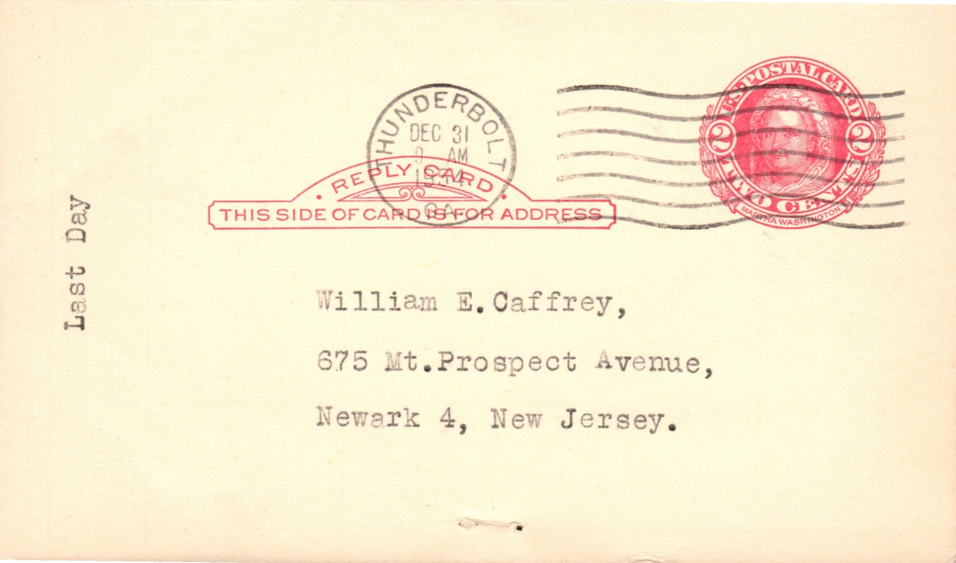 Thunderbolt (1892-1954) 1954 machine cancel on LD Postal Card