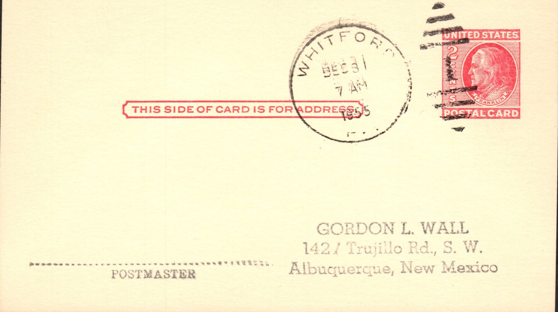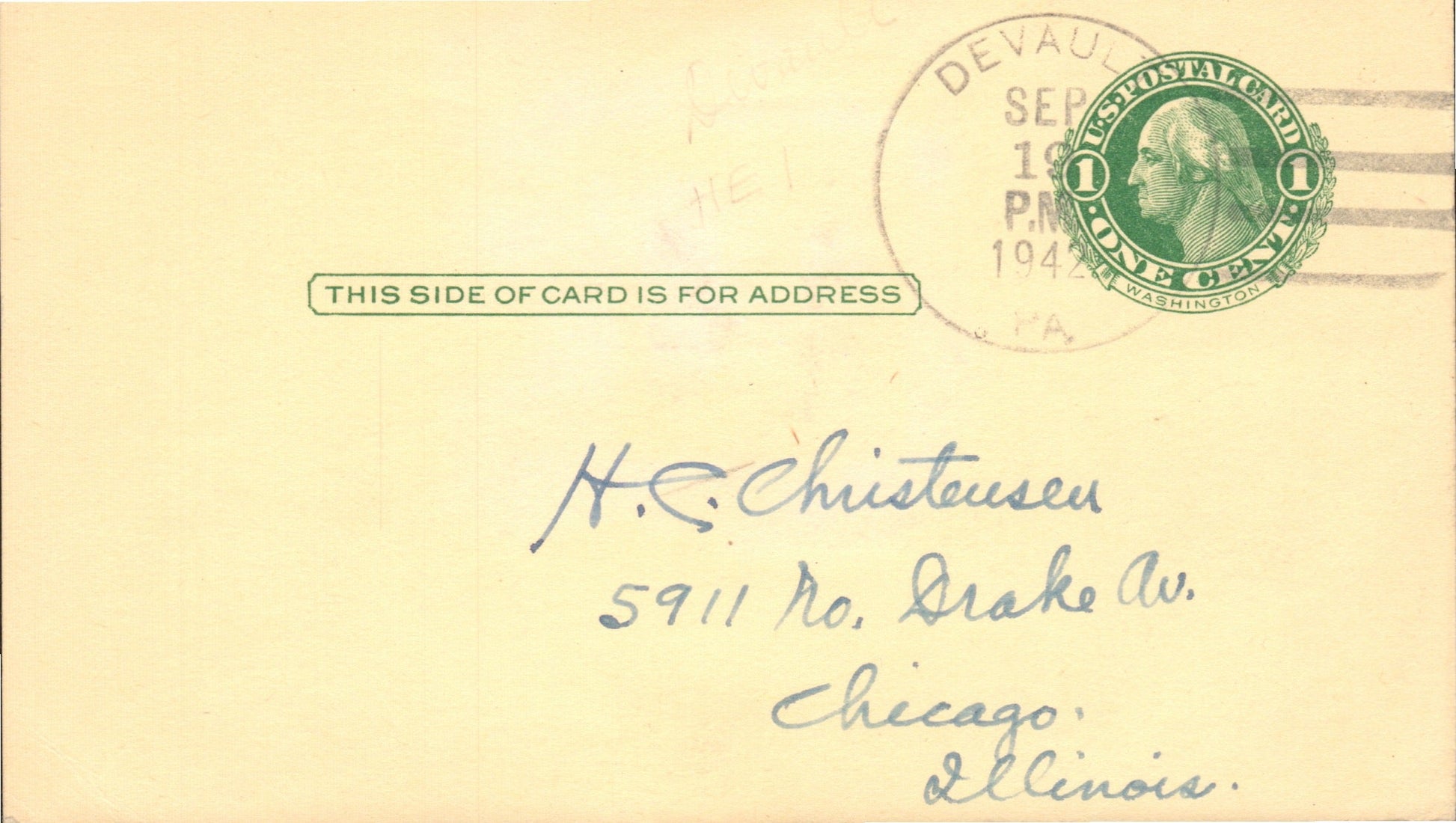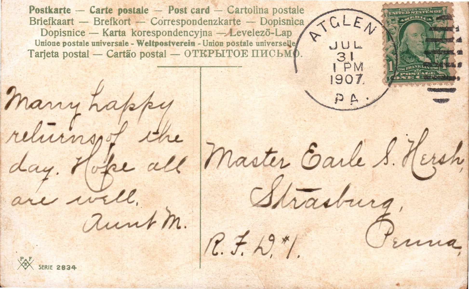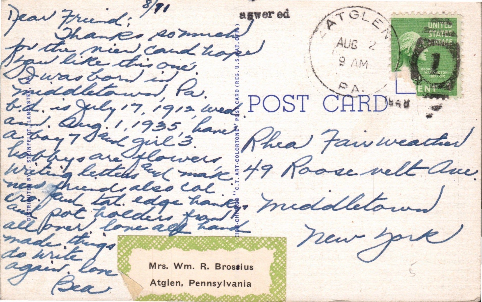Atglen 1907 duplex on post card;1948 date-out duplex on post card of Marshall College