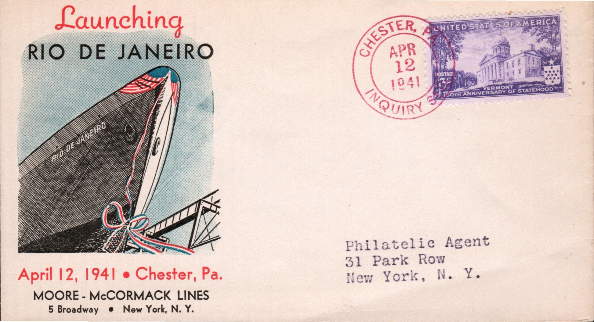 Chester PA Inquiry Sta. 1941 round dater on cacheted cover, ship launching of Rio de Janeiro
