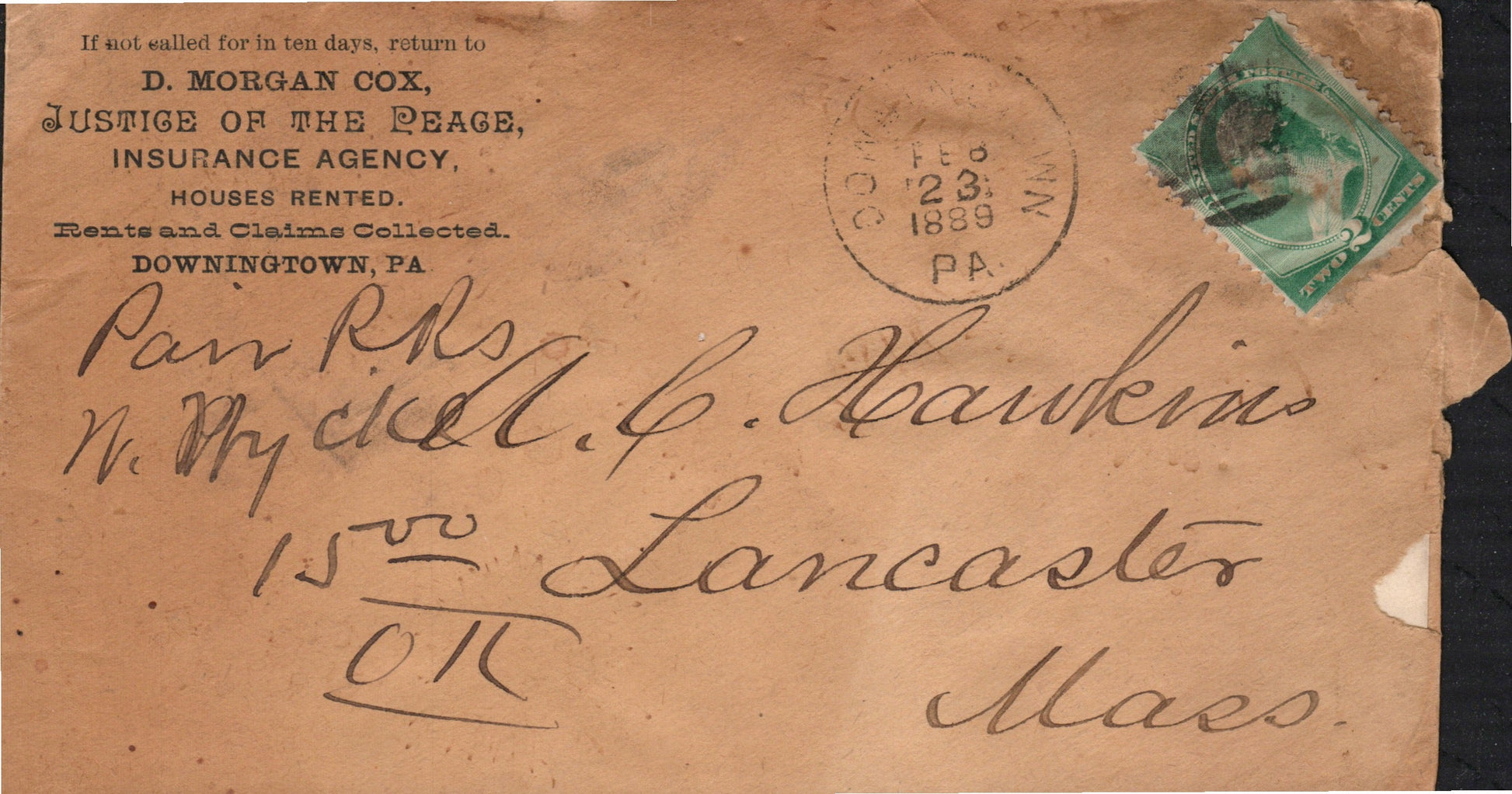 Downington 1889 light cds with a Justice of the Peace & Insurance Co. corner