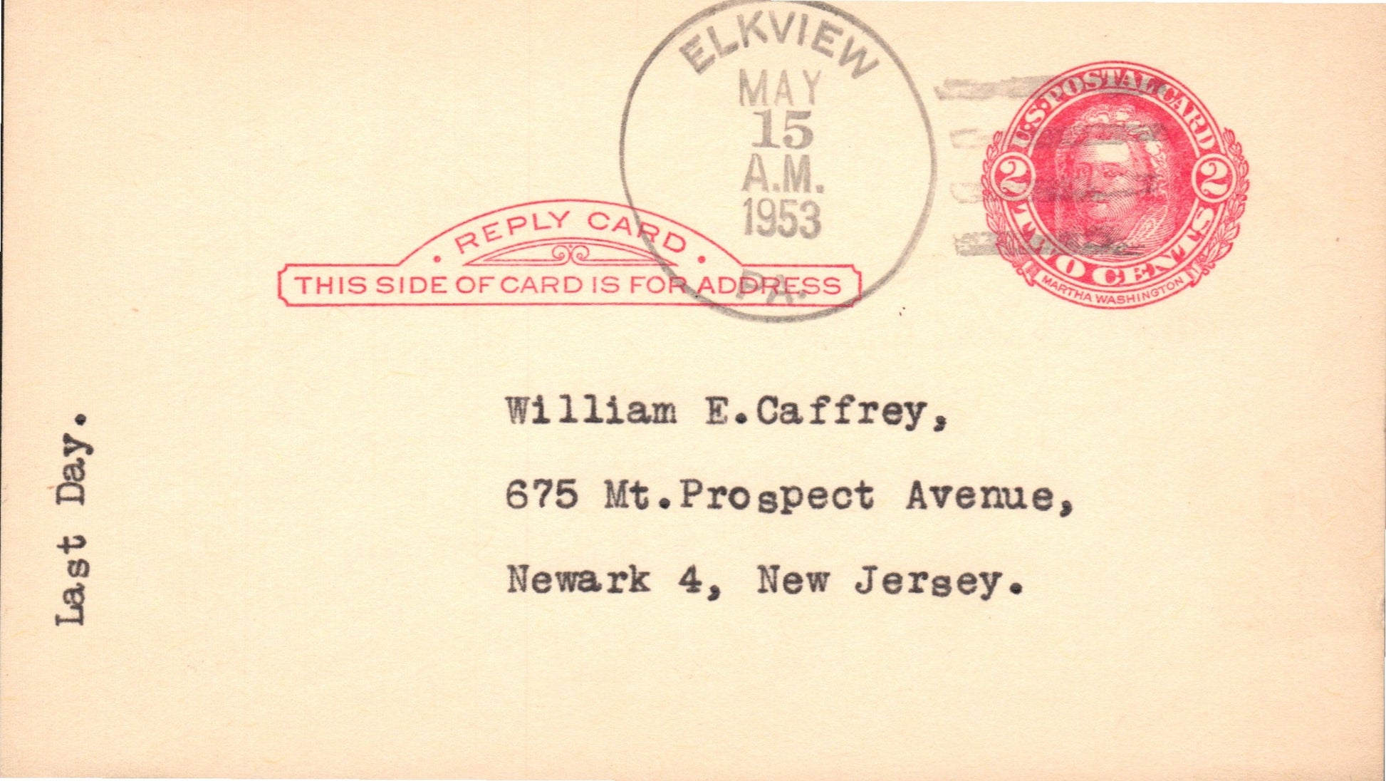 Elkview (1861-1953) 1953 4-bar on LD Postal Card
