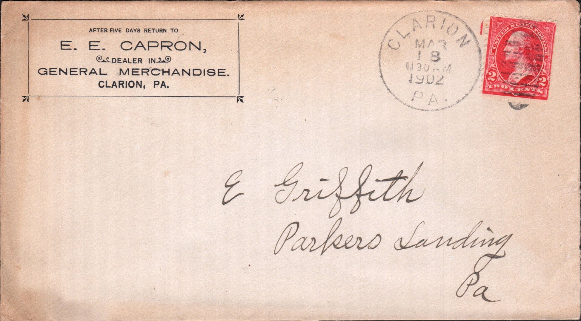 Clarion 1902 duplex on cover, “E.E. Capron, General Merchandise” corner.
