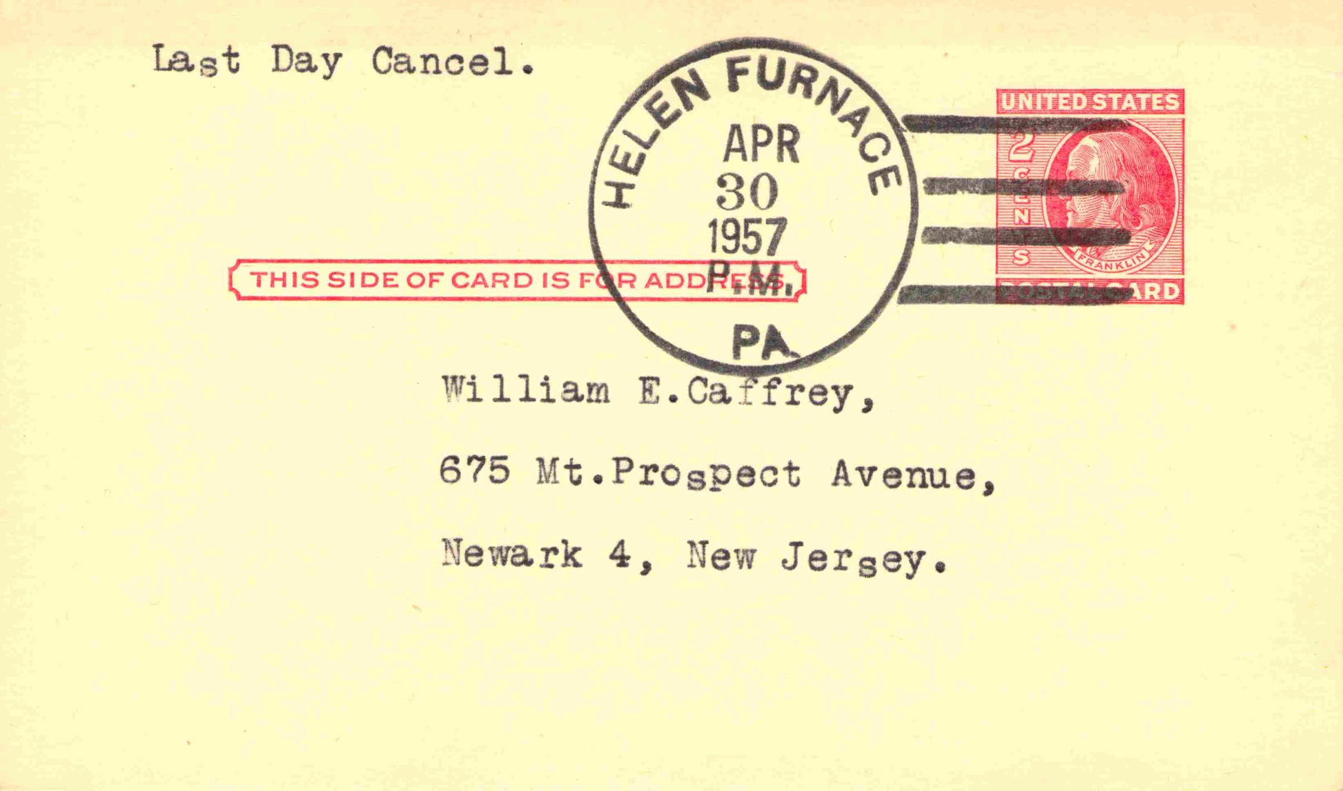 Helen Furnace (1851-1957) 1957 4-bar on Postal Card
