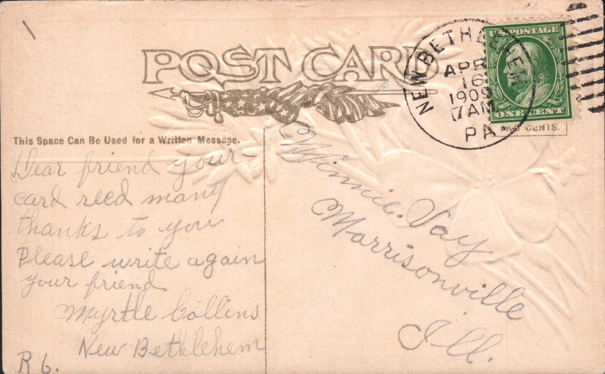 New Bethlehem 1909 duplex on post card; 1919 date-out duplex on post card, stamp removed
