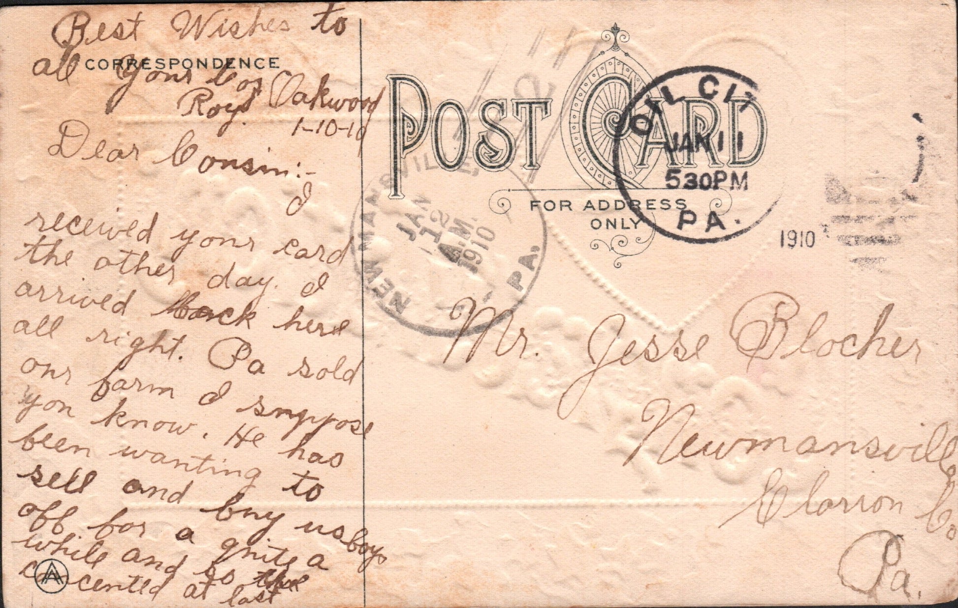 Newmansville (1868-1958) 1910 4-bar as rec’d mark on post card from Oil City, stamp removed; 1958 4-bar on cacheted LD cover, PM autograph