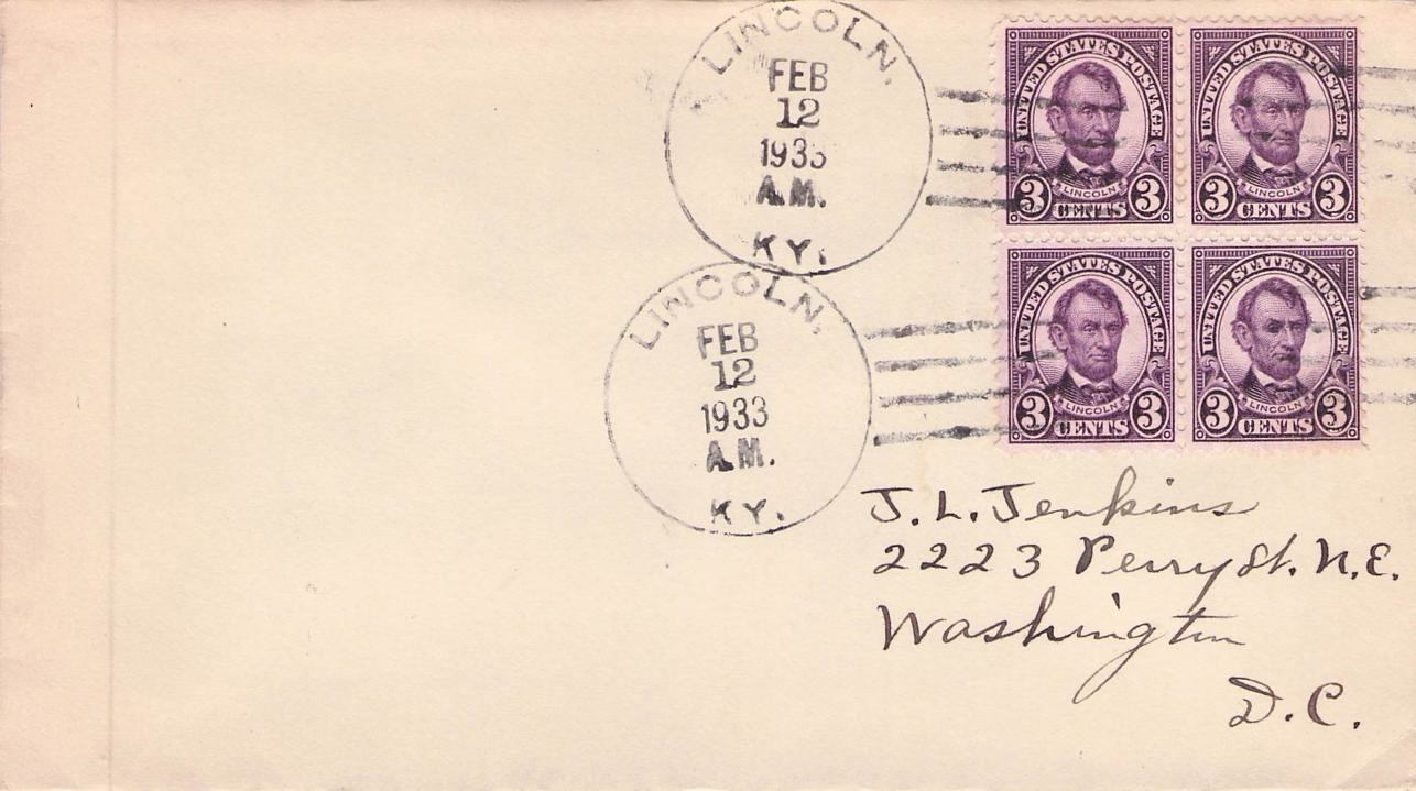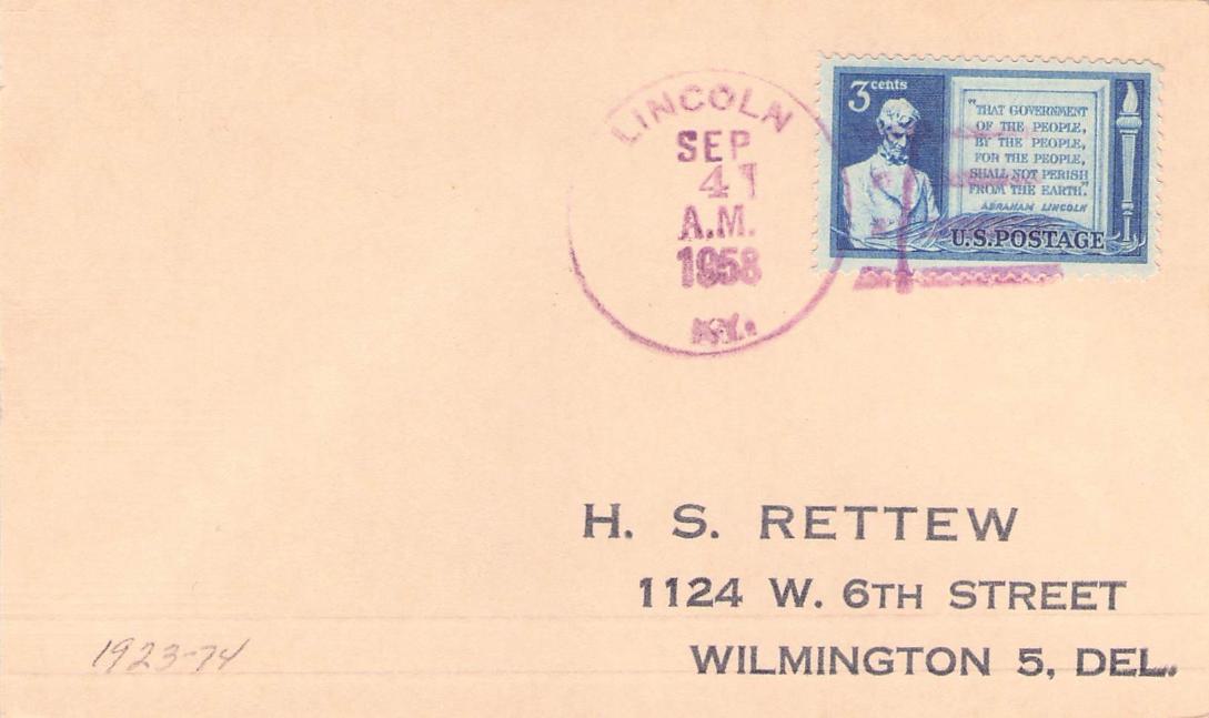 Lincoln Two 1935 4-bars on cover with block of 4 of Lincoln stamp; 1958 4-bar on 3x5 card