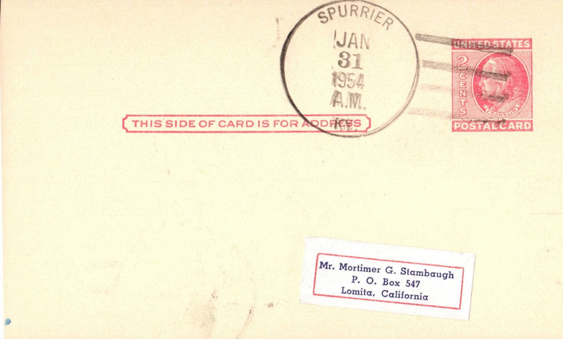 Spurrier 1954 4-bar on Postal card