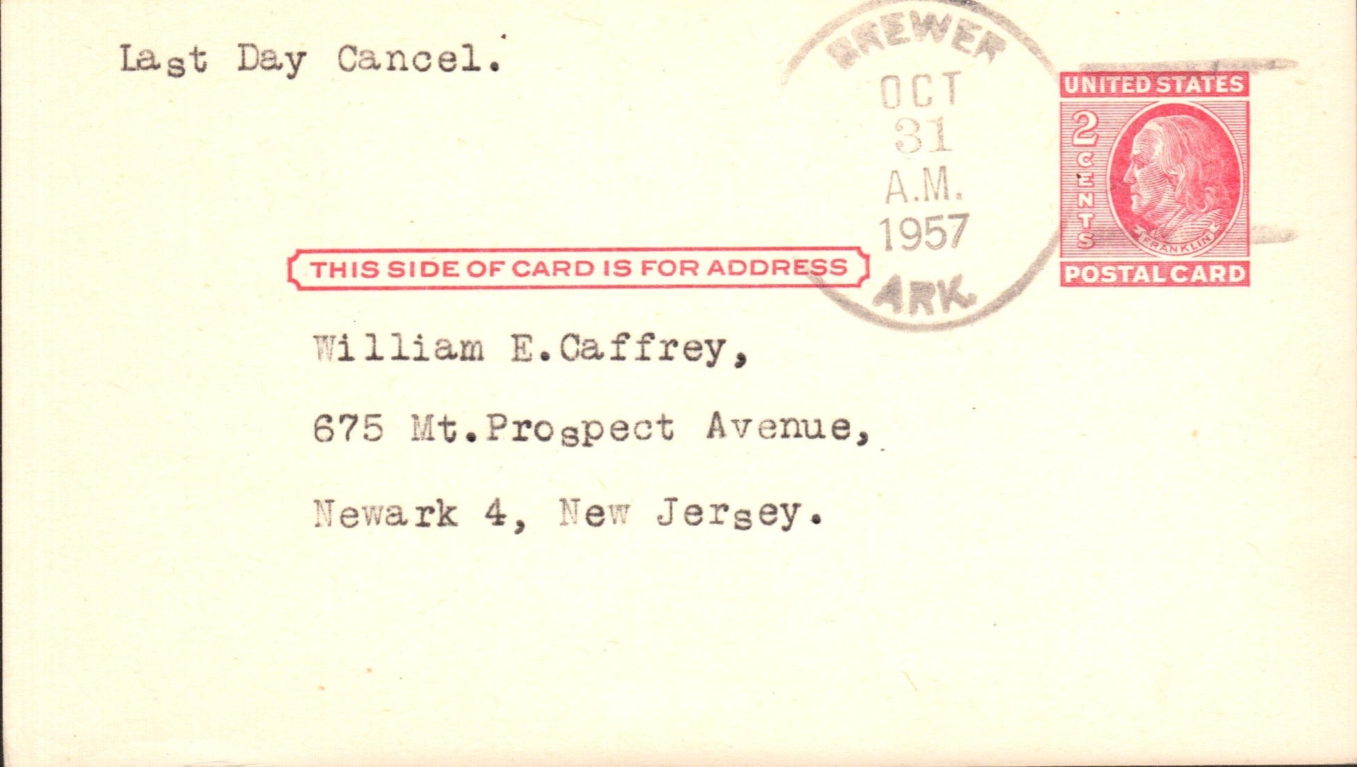 Brewer (1906-1957) 1957 4-bar on LD Postal Card