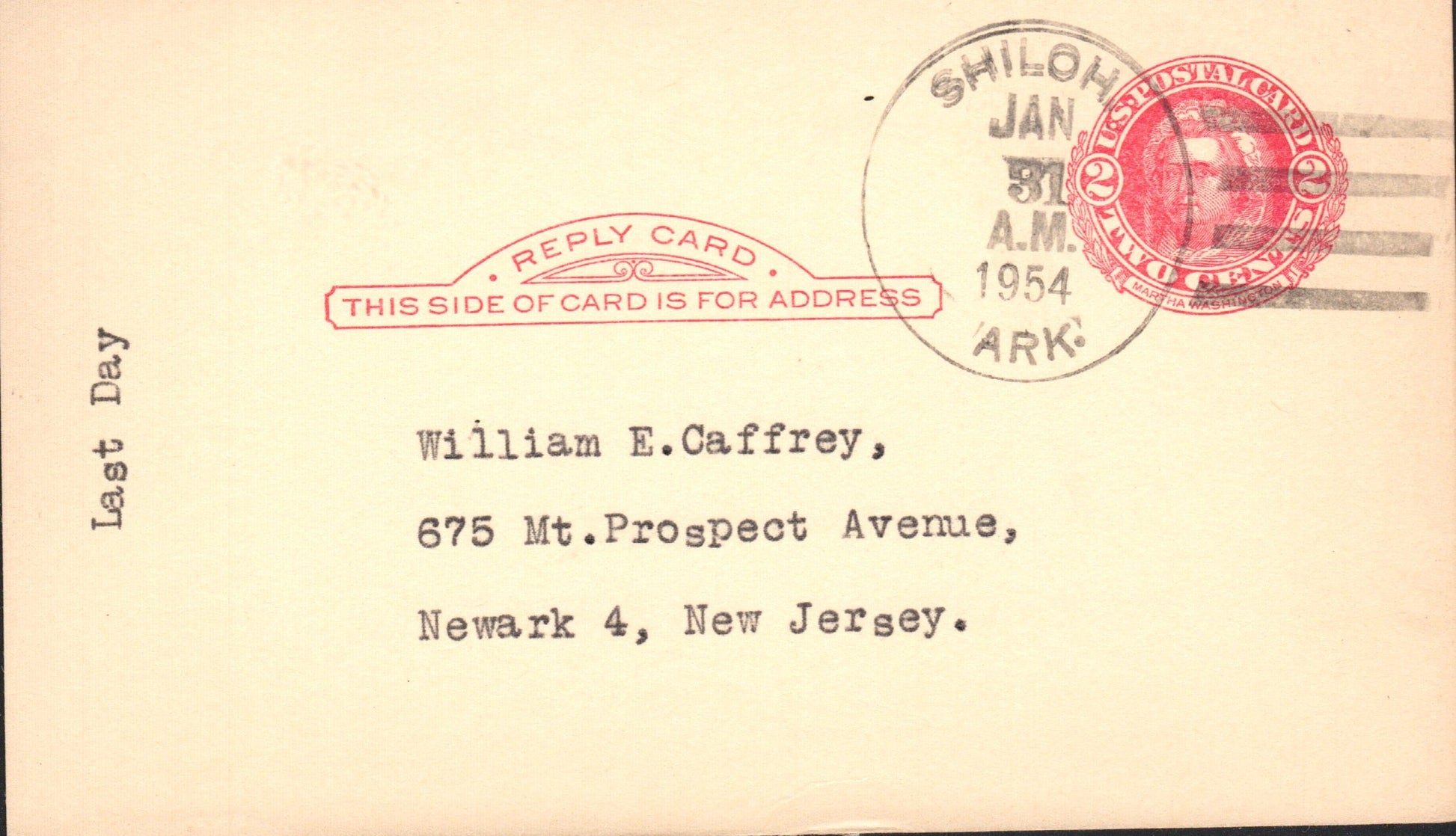 Shiloh (1871-1954) 1954 4-bar on LD Postal Card