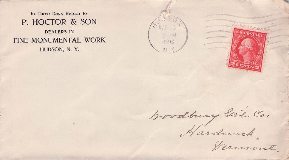 Hudson c.1880 cds on cover; 1916 machine cancel on cover, corner “P. Hoctor & Son, Fine Monumental Work;” 1923 machine cancel on cover, return Wendover Neefus, Stamps for Collectors, original letter included; 1936 duplex on cover with six 1/2¢ stamps