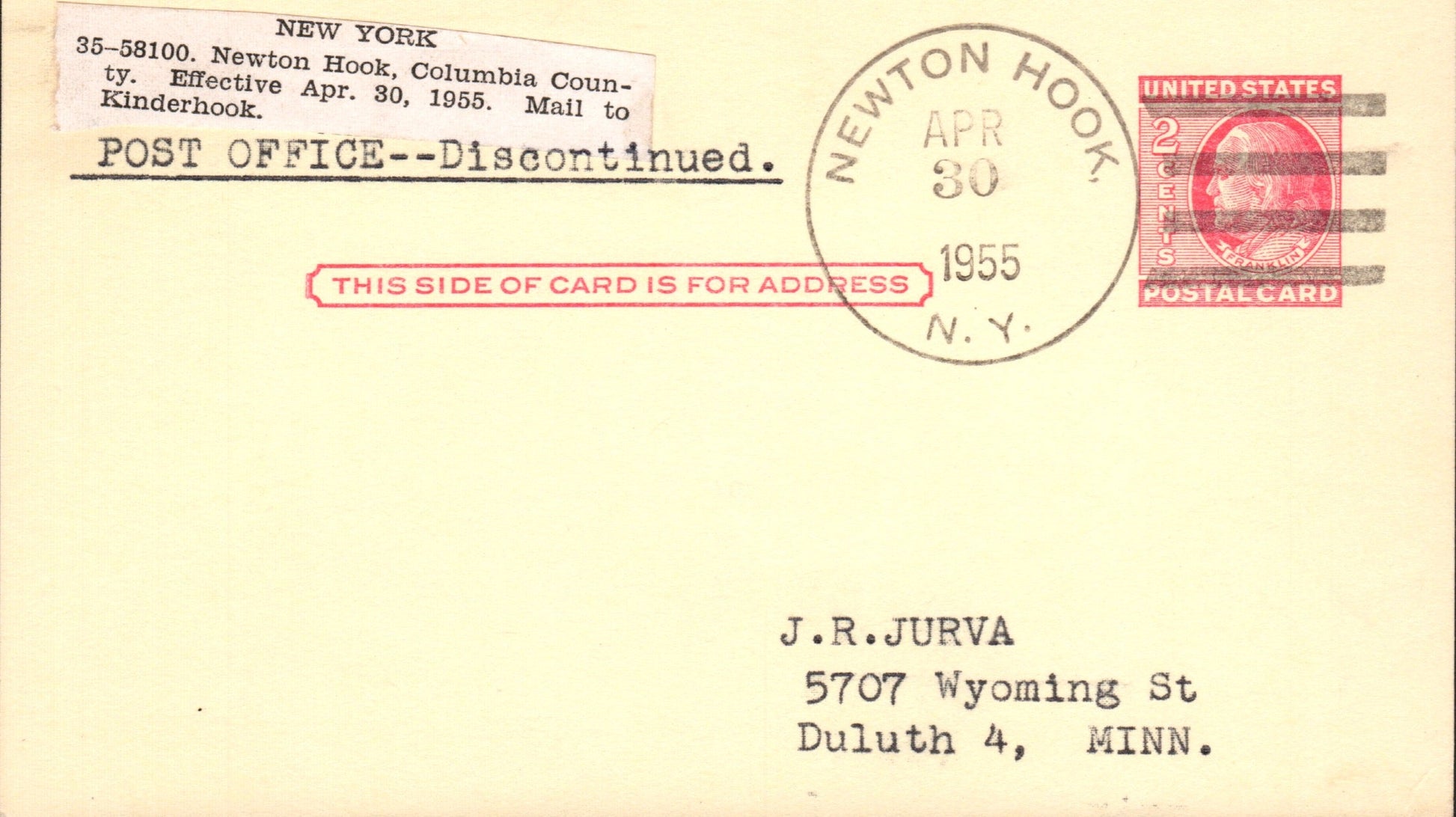 Newton Hook (1902-1955) 1955 4-bar on Last Day Postal Card