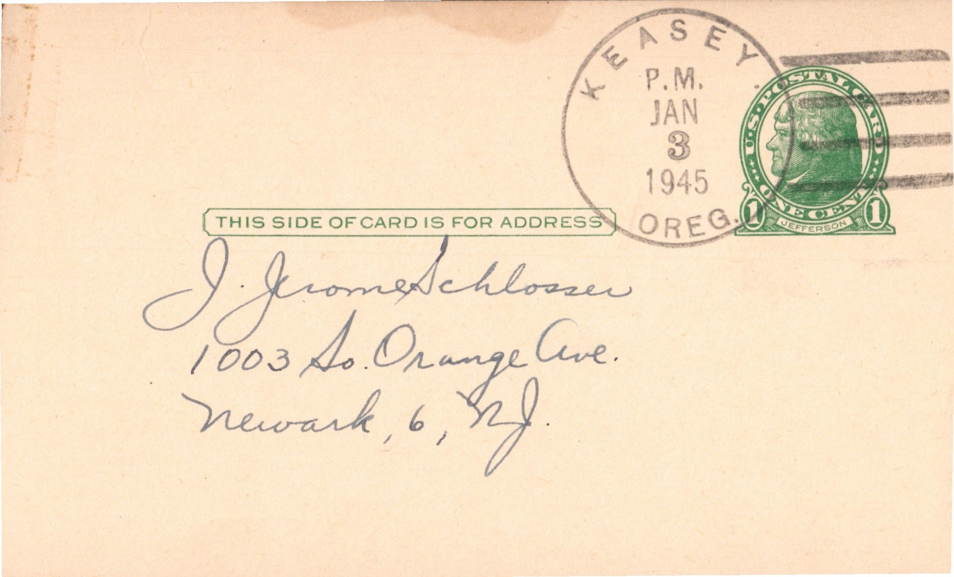 Keasey (1890/1955) 1945 4-bar on Postal Card