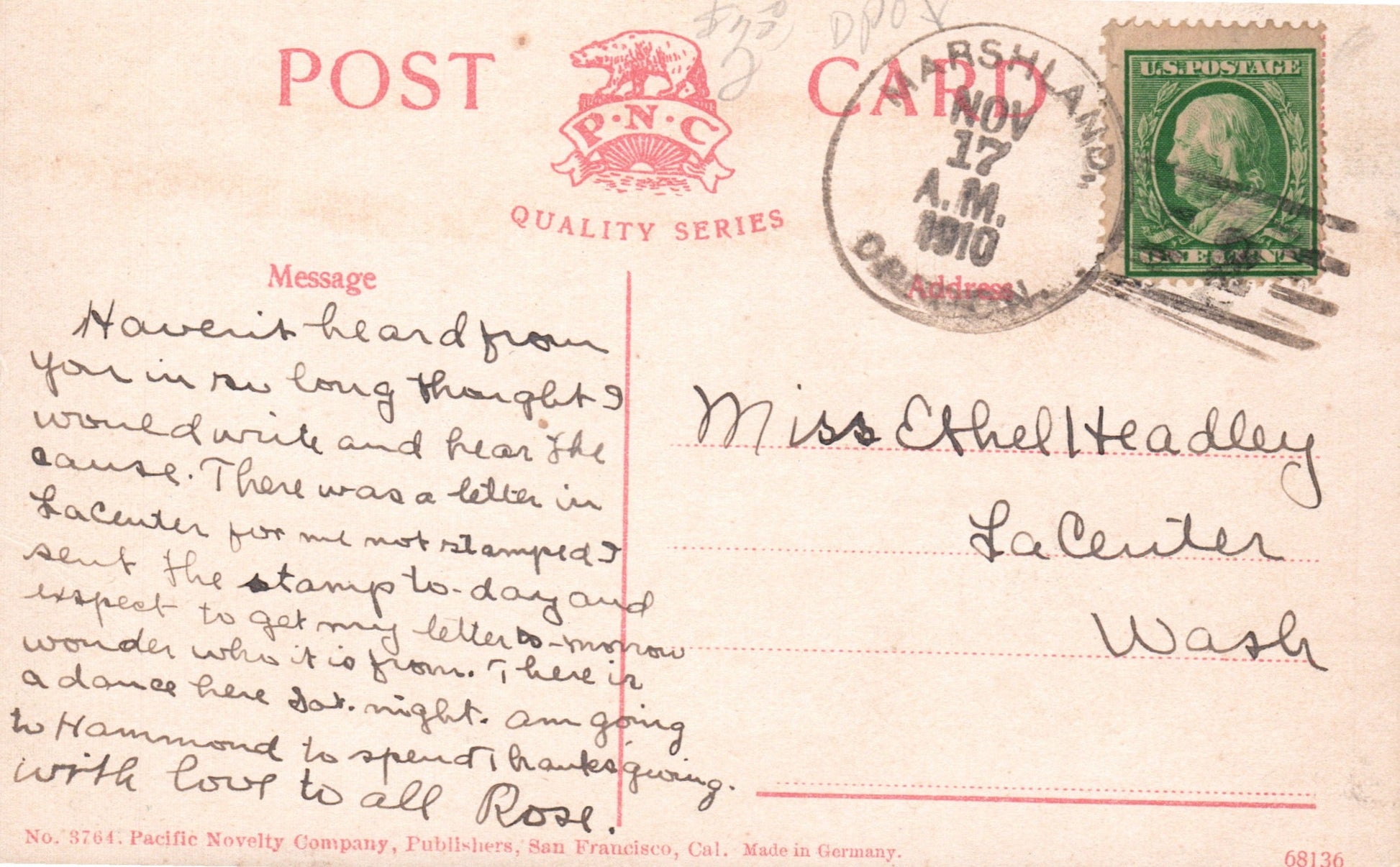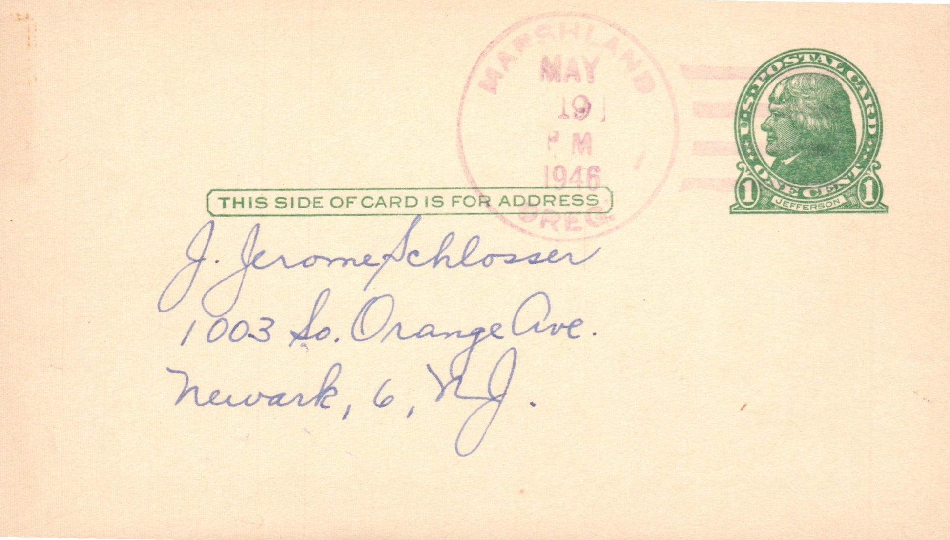 Marshland (1873-1960) 1910 Doane 2 on post card; 1946 4-bar on Postal Card