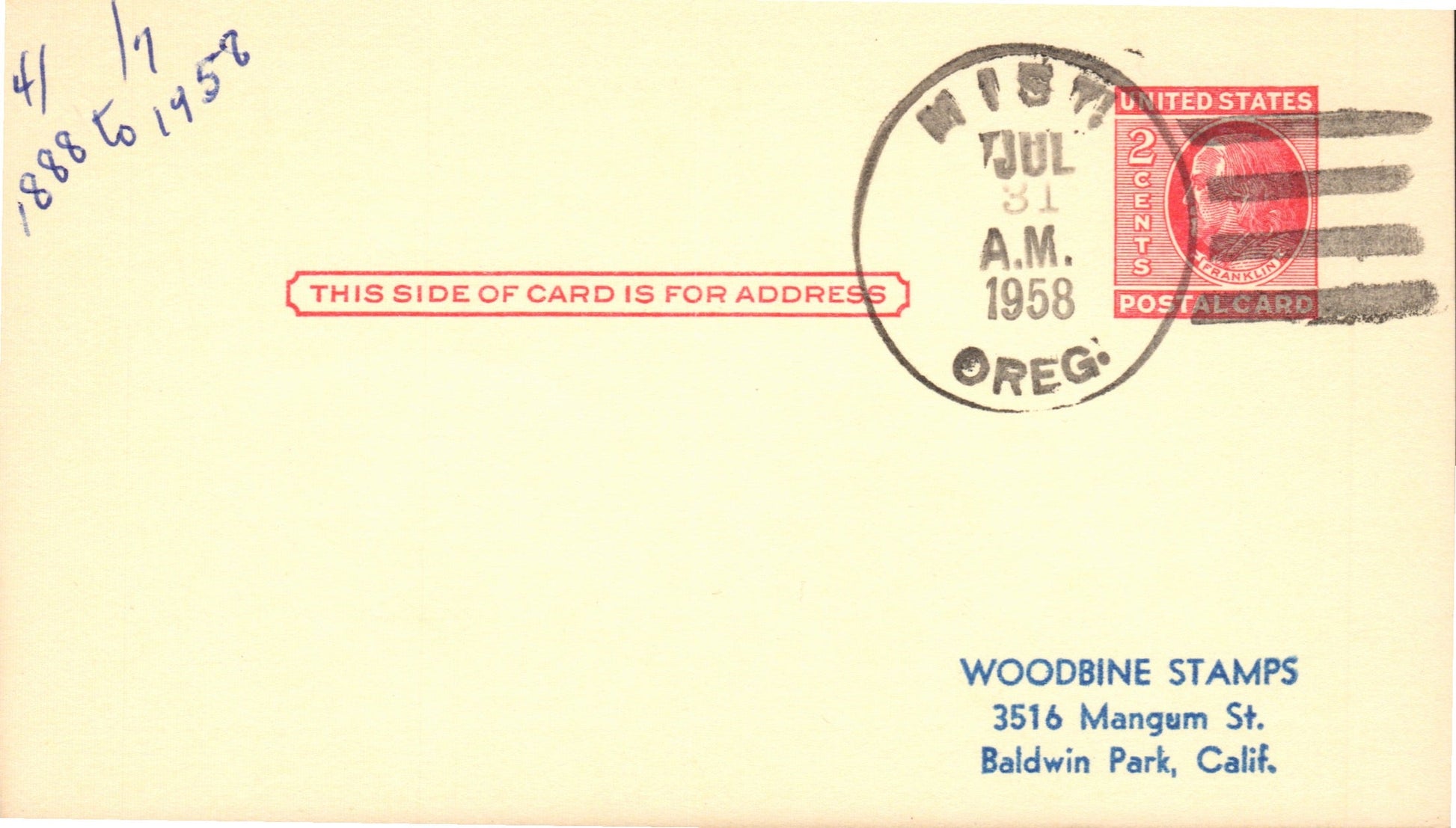 Mist (1888-1958) 1958 4-bar on LD Postal Card