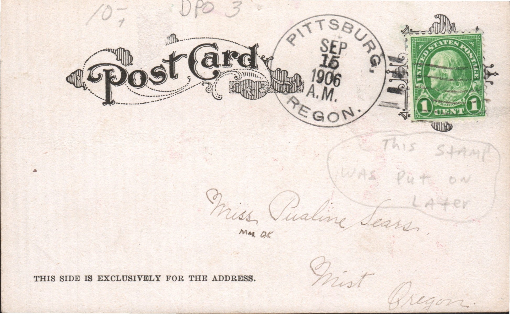 Pittsburg (1882-1908) Very fine 1906 4-bar on post card, but stamp added