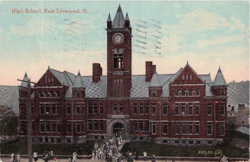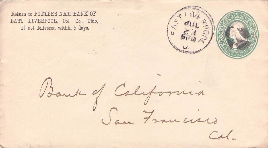 East Liverpool c.1880 cds on cover, “Potters National Bank of East Liverpool” corner; 1908 Flag Cancel on post card. Post card: High School [1912]