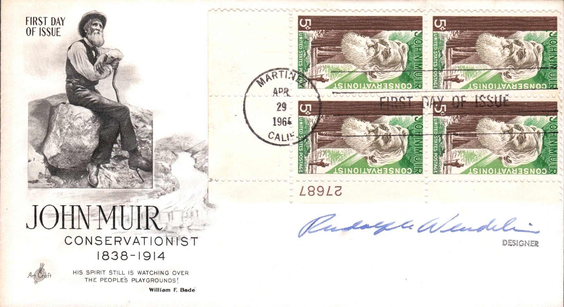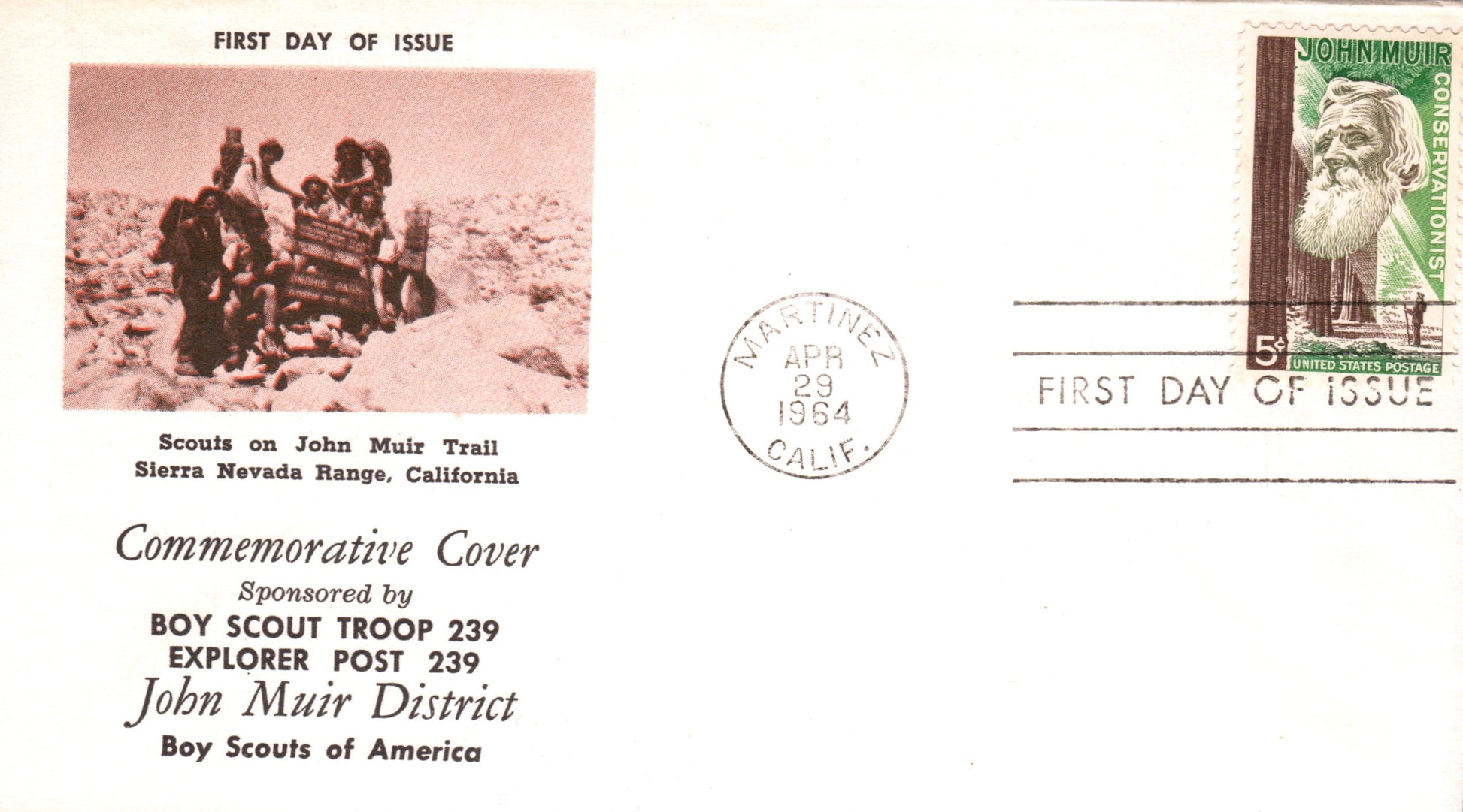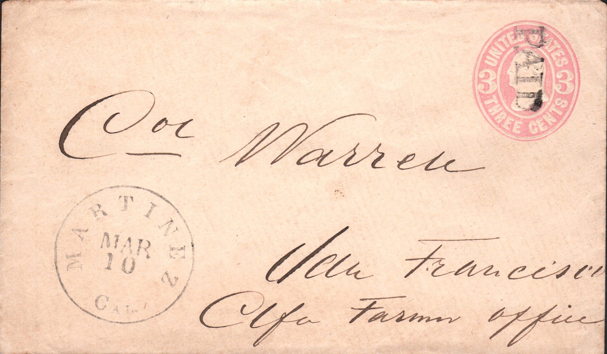 Martinez c.1860 cds and “PAID” on cover; 1964 machine “First Day of Issue” of John Muir stamp on cacheted cover; 1964 machine “First Day of Issue” of John Muir stamp on (diff.) cacheted cover using plate block of four stamps. 1907 Martinez R.F.D. on post card