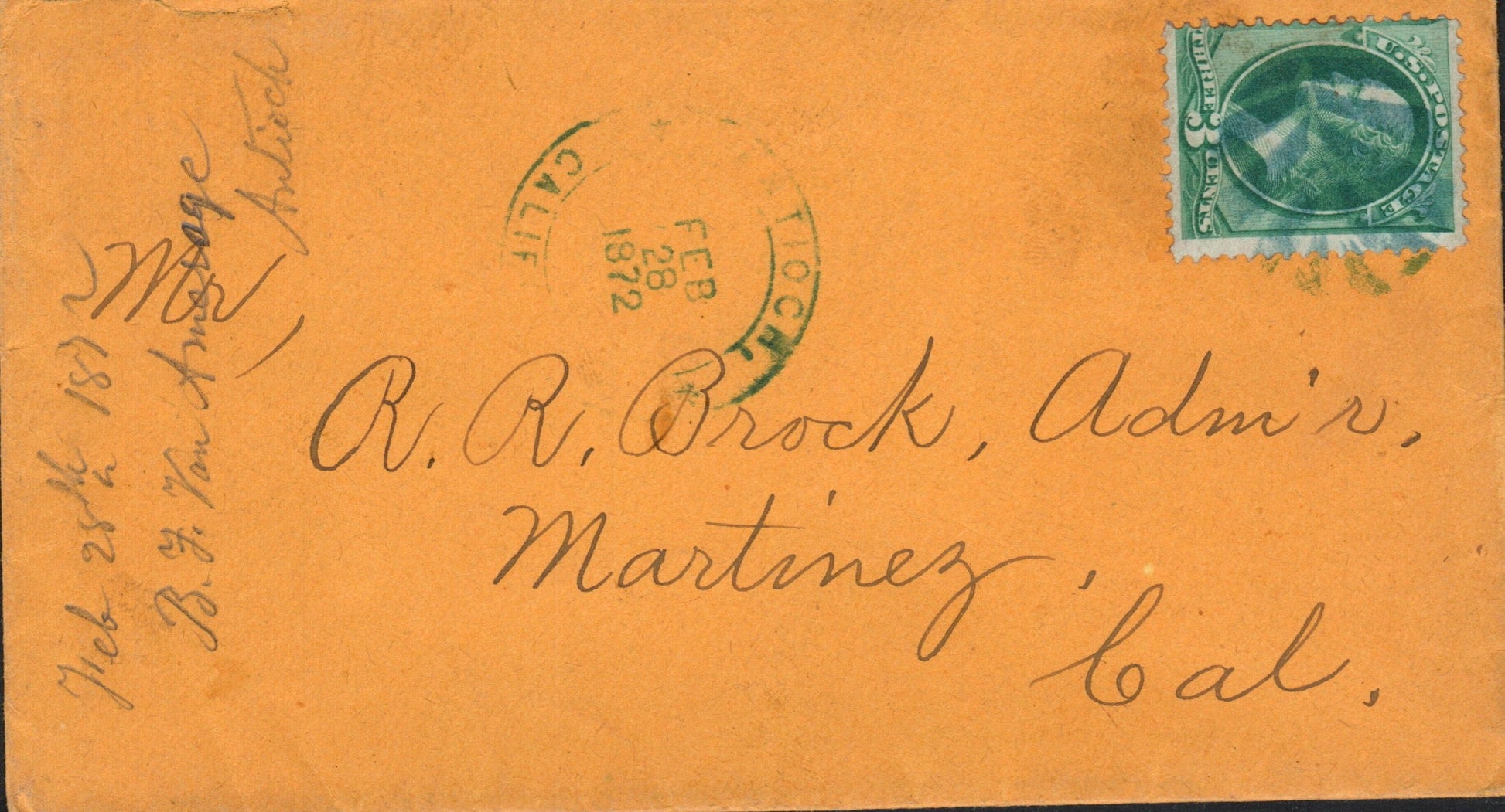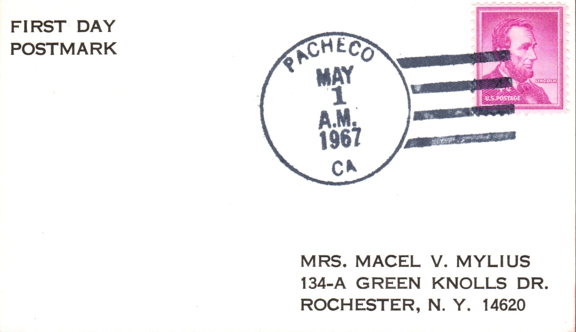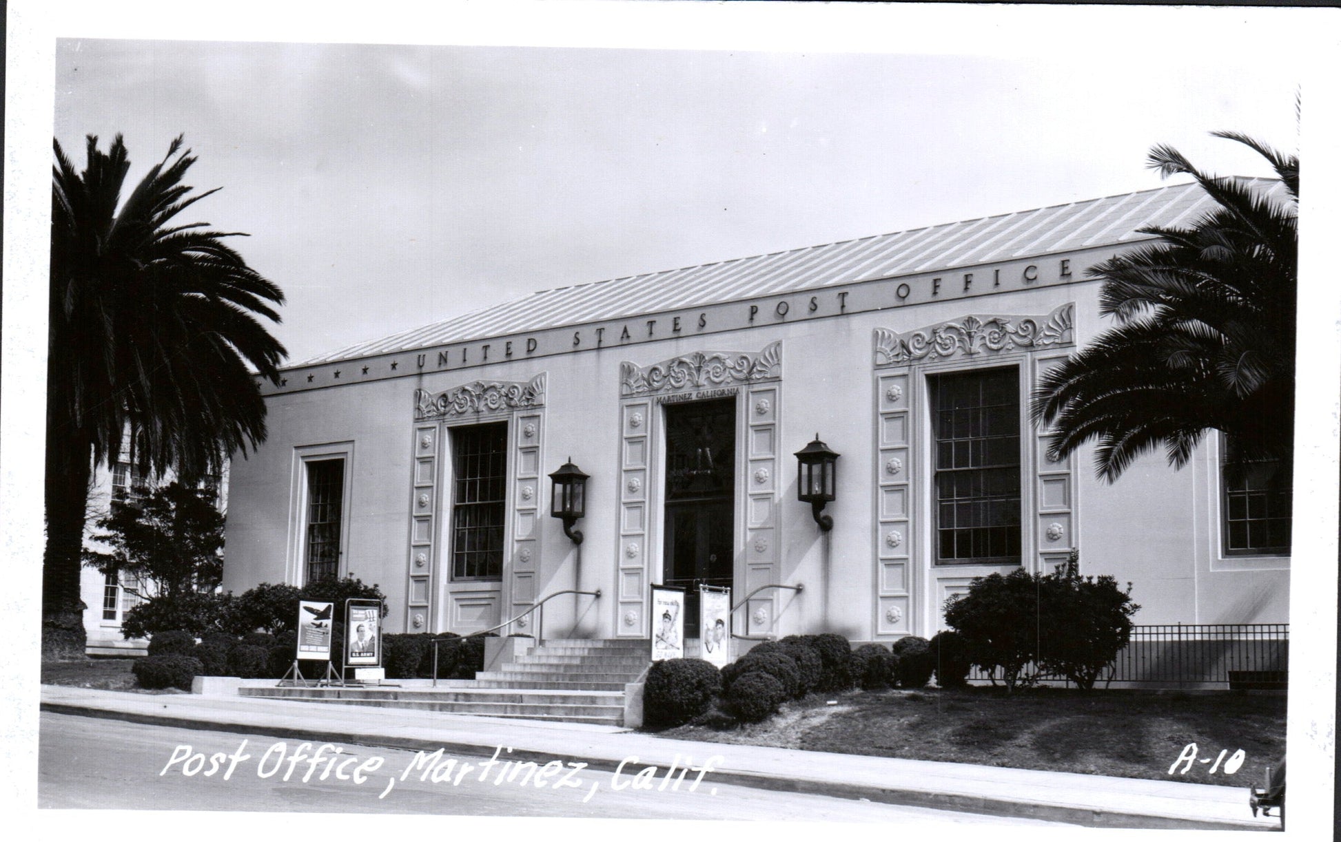 Martinez c.1860 cds and “PAID” on cover; 1964 machine “First Day of Issue” of John Muir stamp on cacheted cover; 1964 machine “First Day of Issue” of John Muir stamp on (diff.) cacheted cover using plate block of four stamps. 1907 Martinez R.F.D. on post card