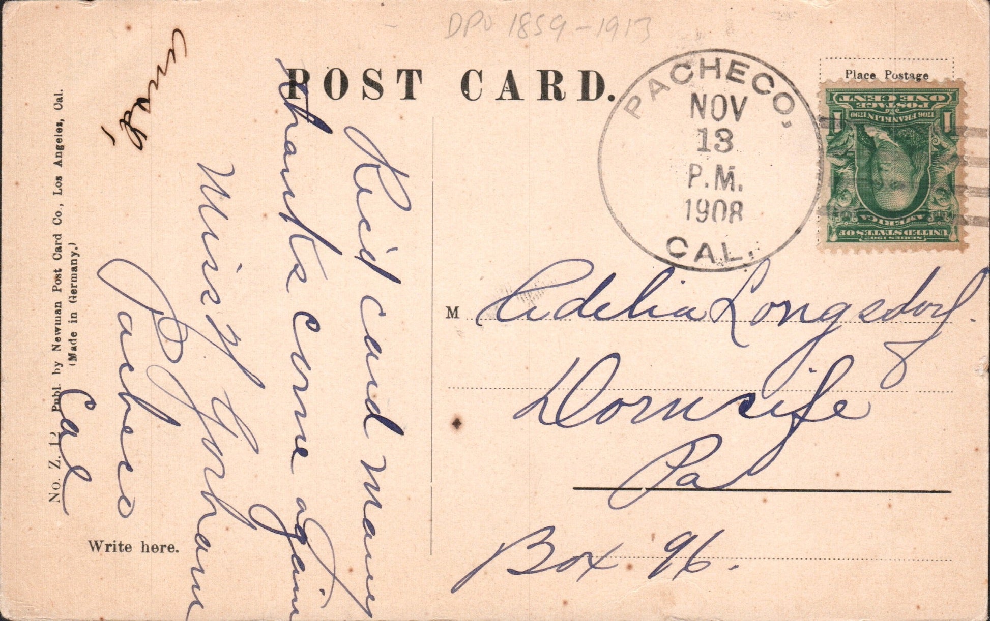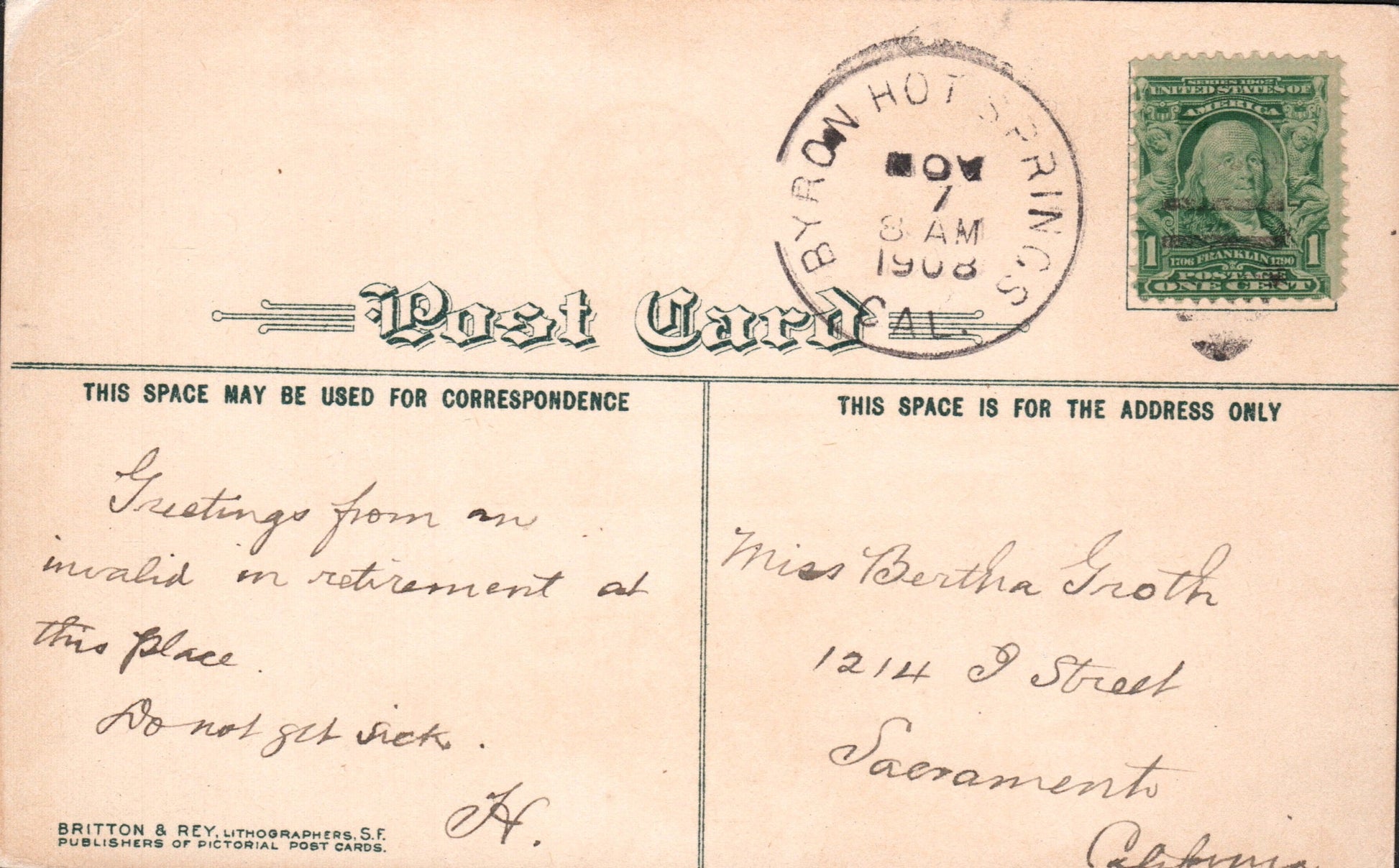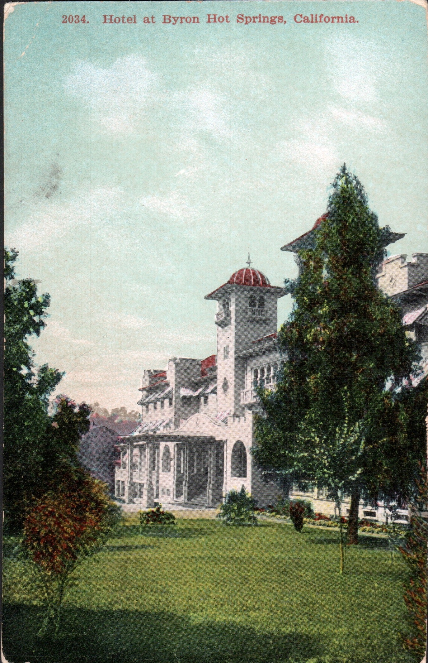 Byron Hot Springs (1889-1930) 1907 duplex on post card, view of hotel at hot springs