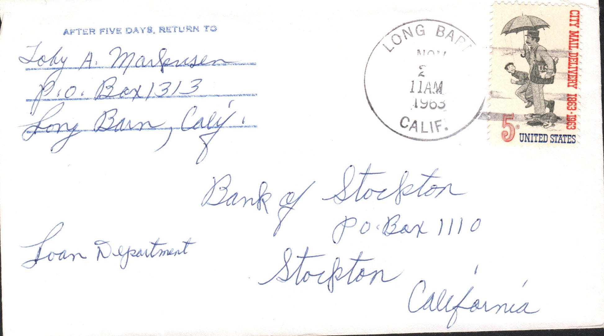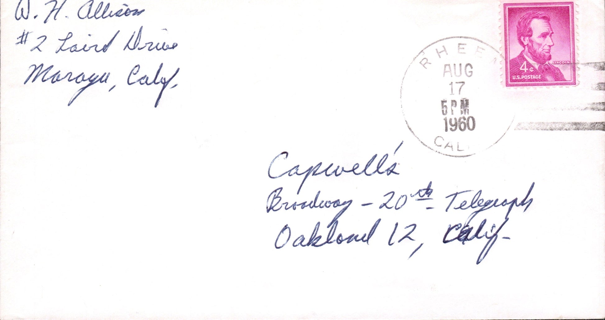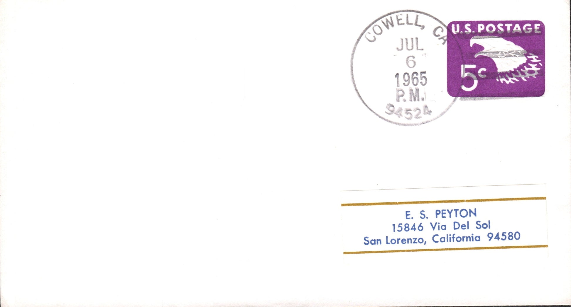 Orinda 1965 double circle on cover; 197? machine cancel on cover with tear
