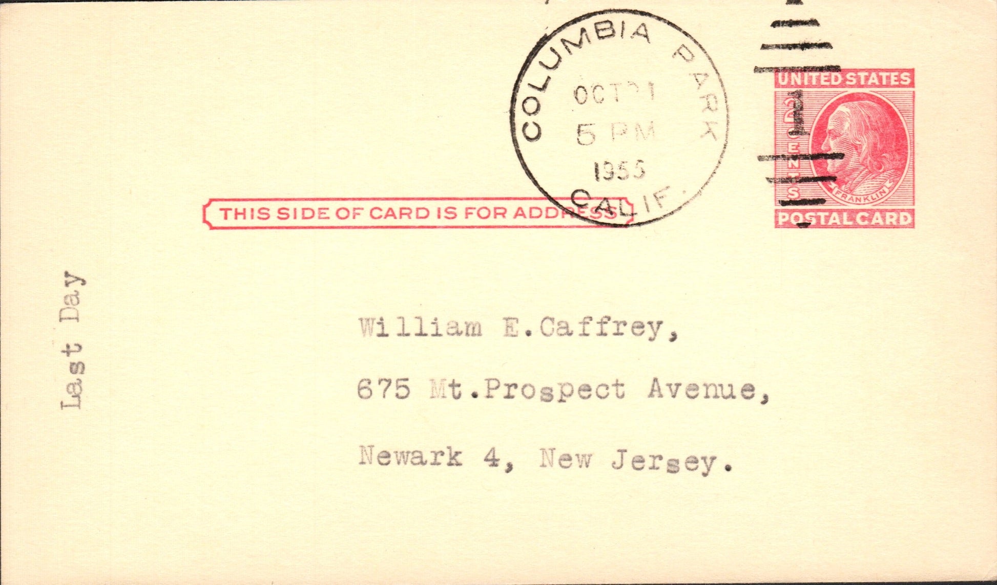 Columbia Park (1943-1955) 1955 4-bar on LD Postal Card