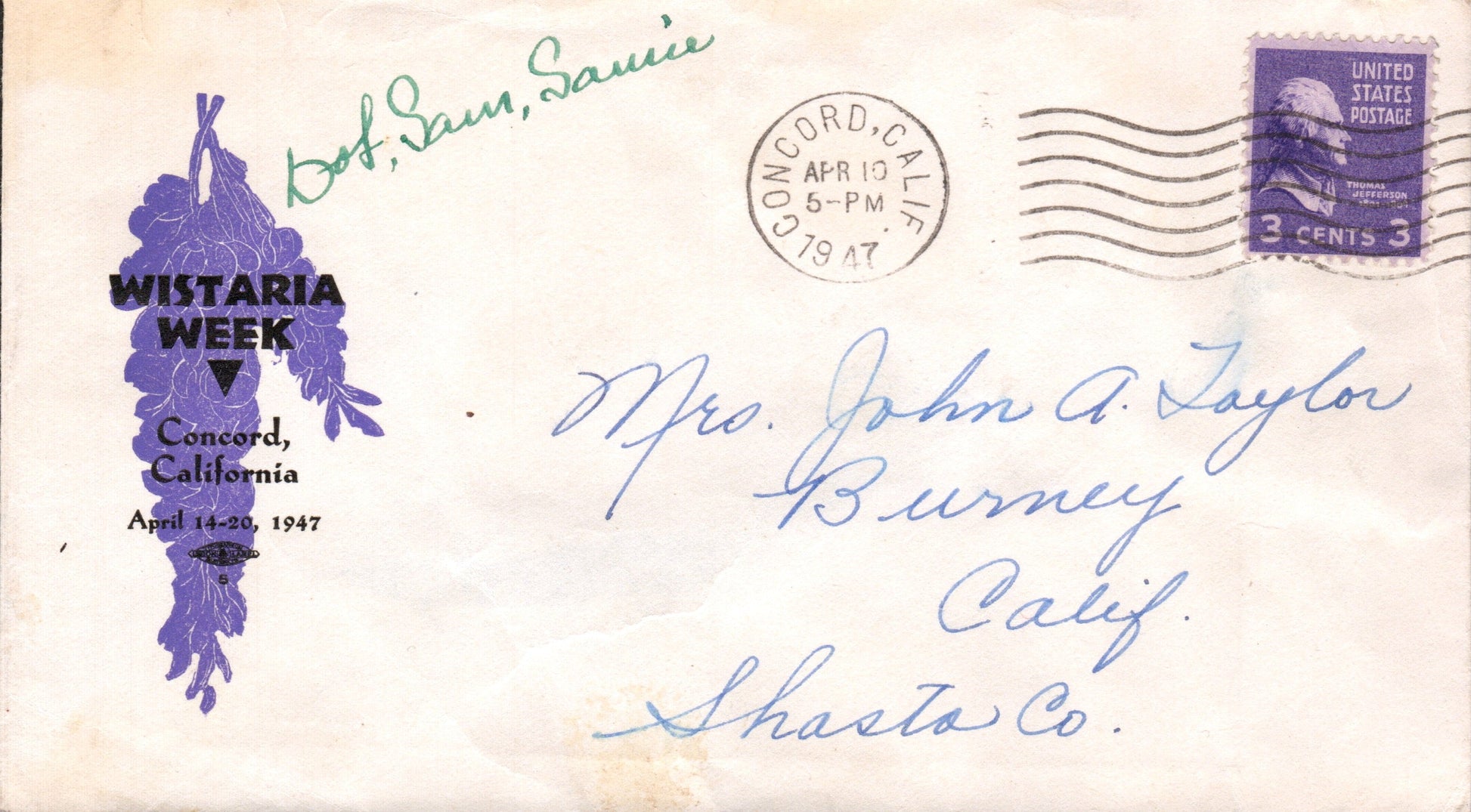 Concord 1947 machine cancel on cacheted cover, “Wisteria Week”; 1971 machine cancel on cover
