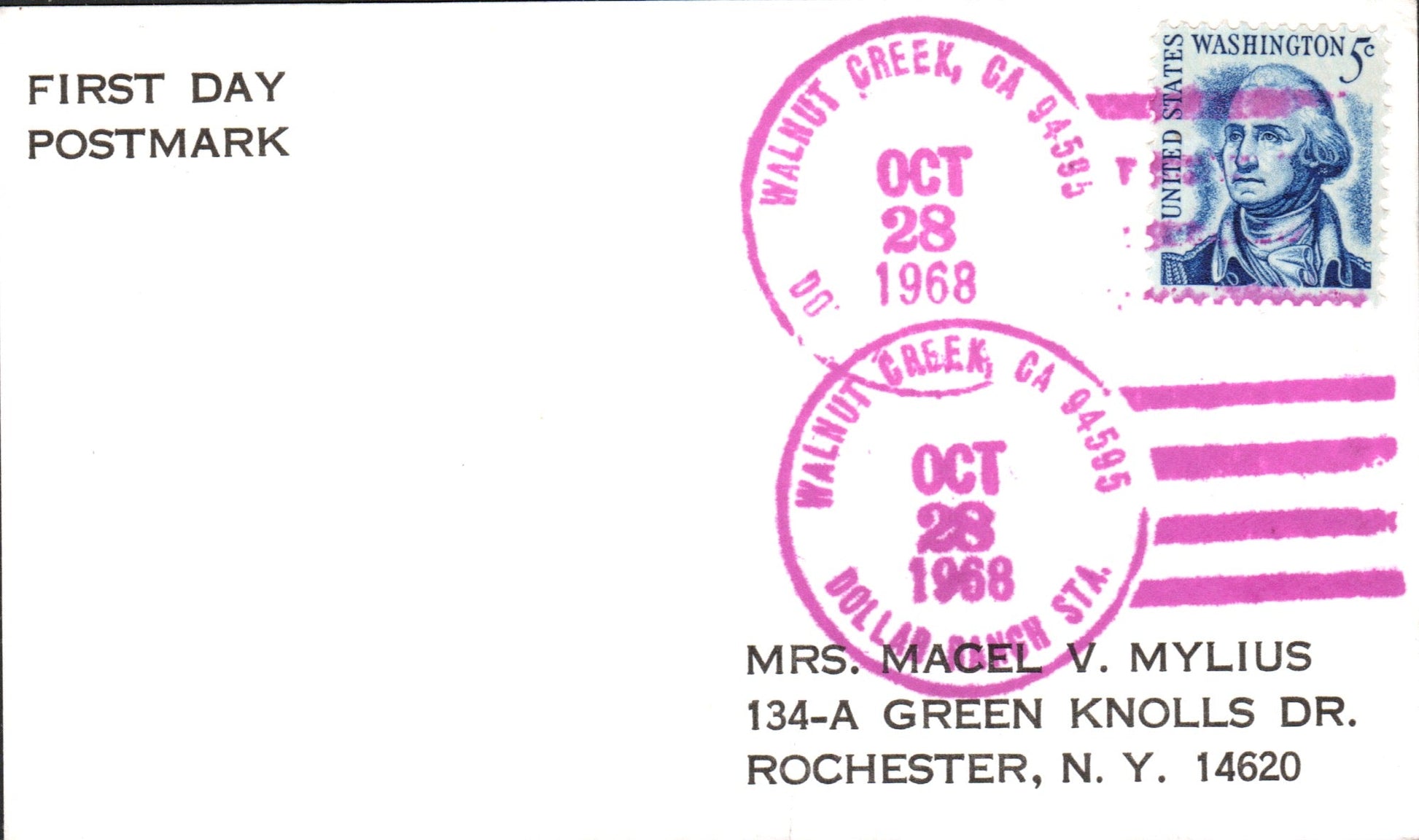 Dollar Ranch S (Walnut Creek) 1968 4-bar on 3x5 card, FD of postal status