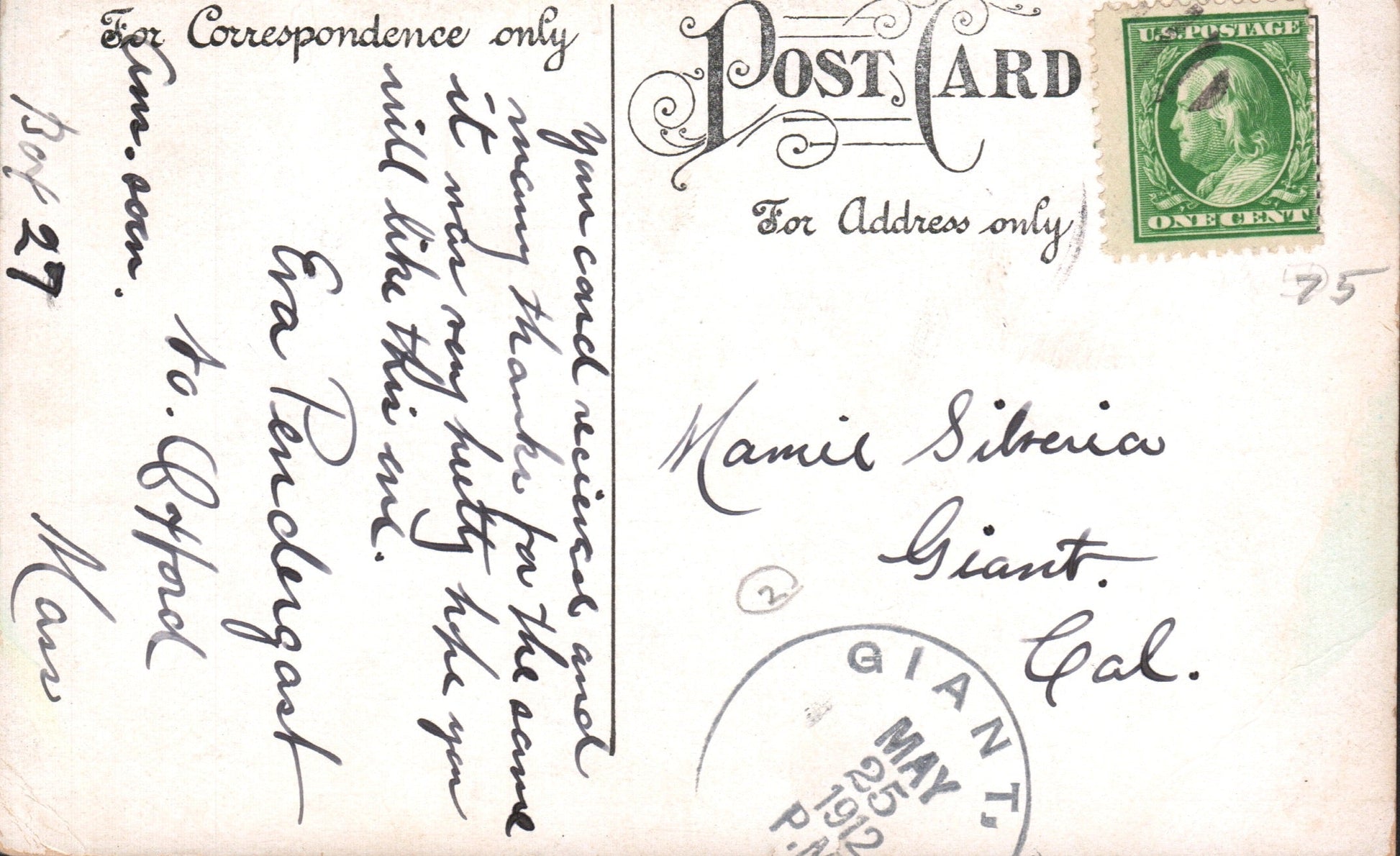Giant (1895-1936) 1912 4-bar as rec. mark on post card
