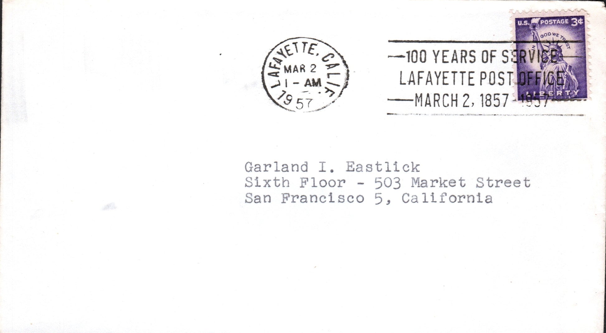 Lafayette 1957 machine slogan “100 Years of Service/Lafayette Post Office” on cover; 1968 machine cancel on cover; 1971 machine cancel on cover